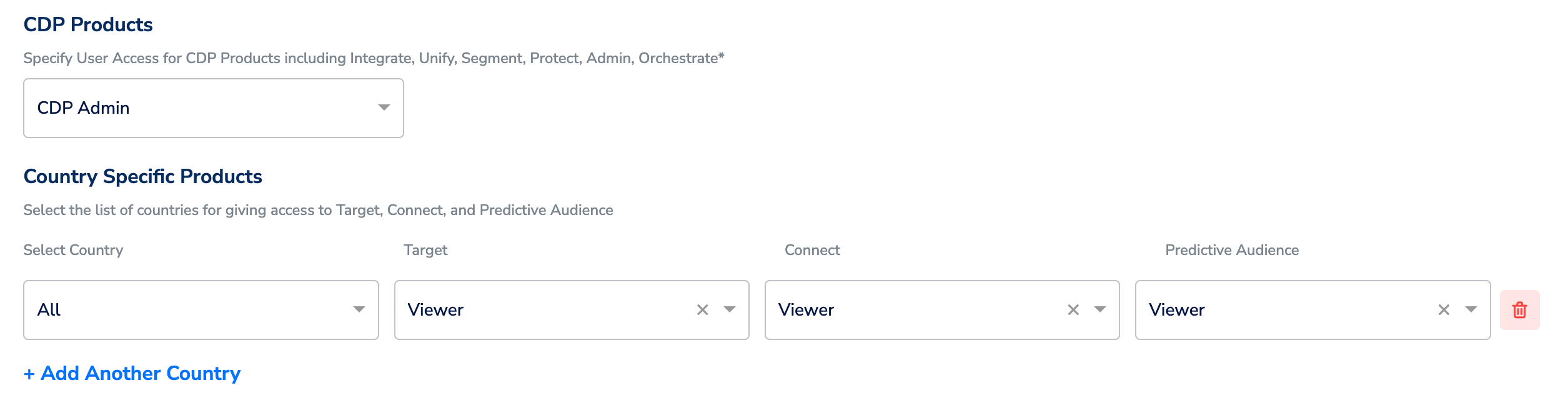 - Country Specific Product – Select the list of countries for giving access to Target, Connect and Predictive Audience.