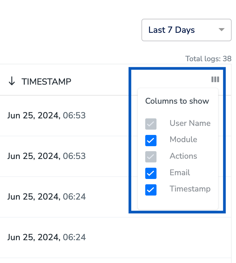 Perform the following steps to view Audit Logs for your Organisation on Zeotap CDP:In the new screen that appears, you can view the list of log entries for your Organisation for the last 7 days. You can adjust the dates as per your preference. Note that you can choose the time period for which you wish to view the log entries using the drop-down menu as shown below.