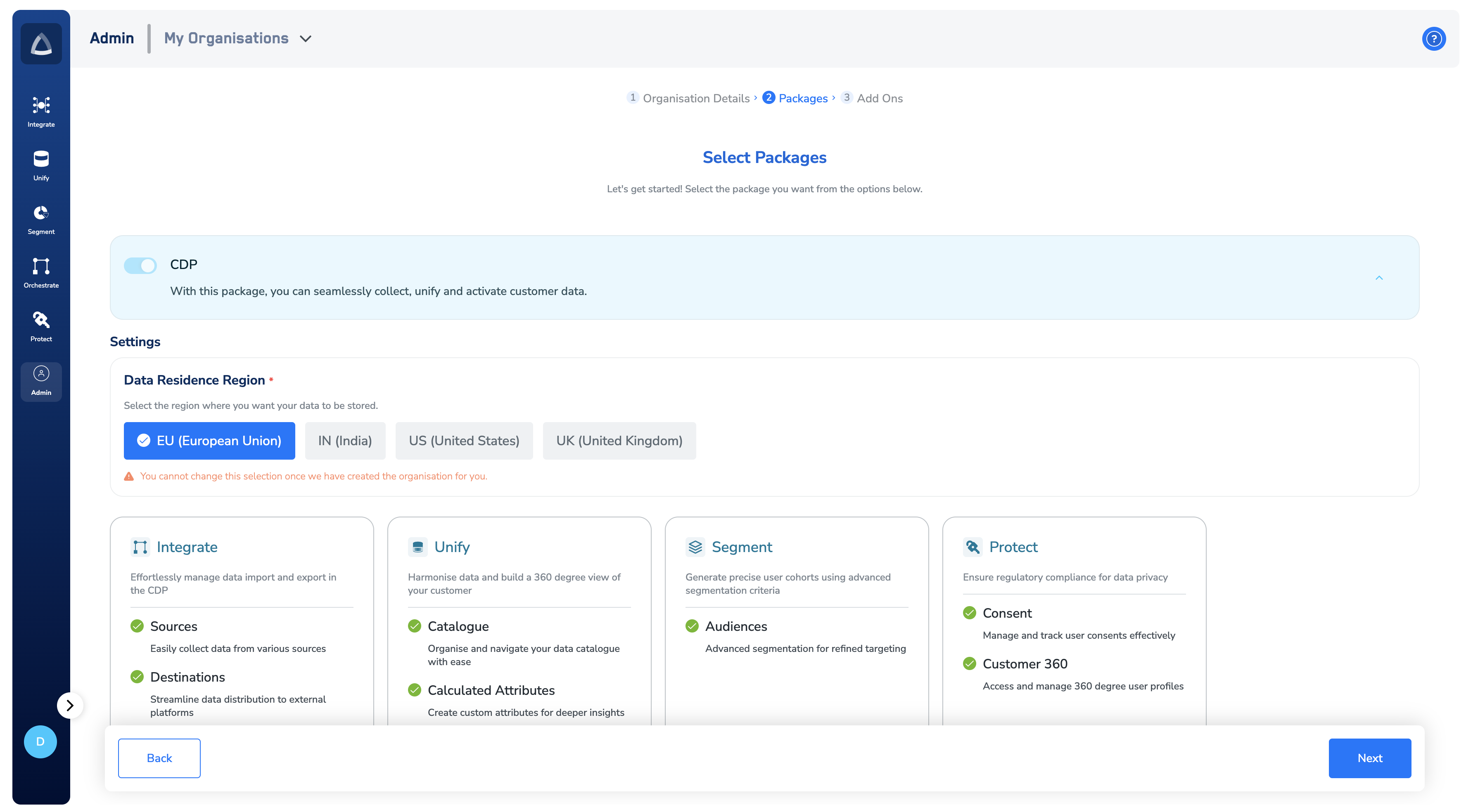 If you choose the CDP package, then ensure to set the region where you want your data to be stored.