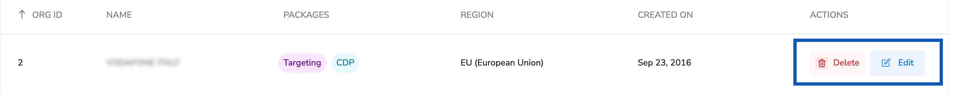 NoteTo make changes to the selected packages, use the Edit button shown below. If an organization created within the Admin module is no longer needed or was created by mistake, you can remove it using the Delete button shown below.