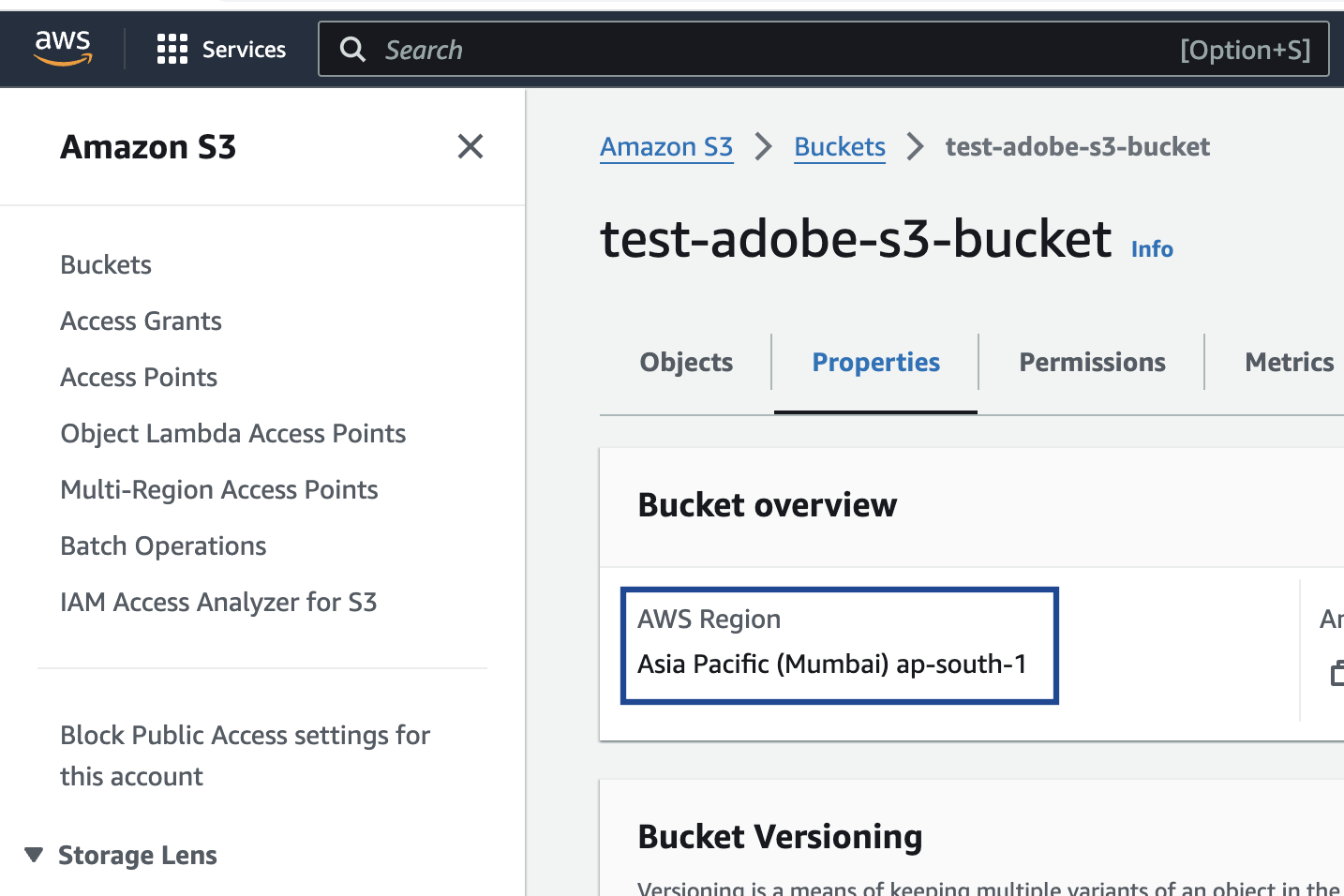 This is the name of your S3 bucket. You can obtain this information on your Amazon S3 account by navigating to Buckets. In the example shown below, test-adobe-s3-bucket is the bucket name.