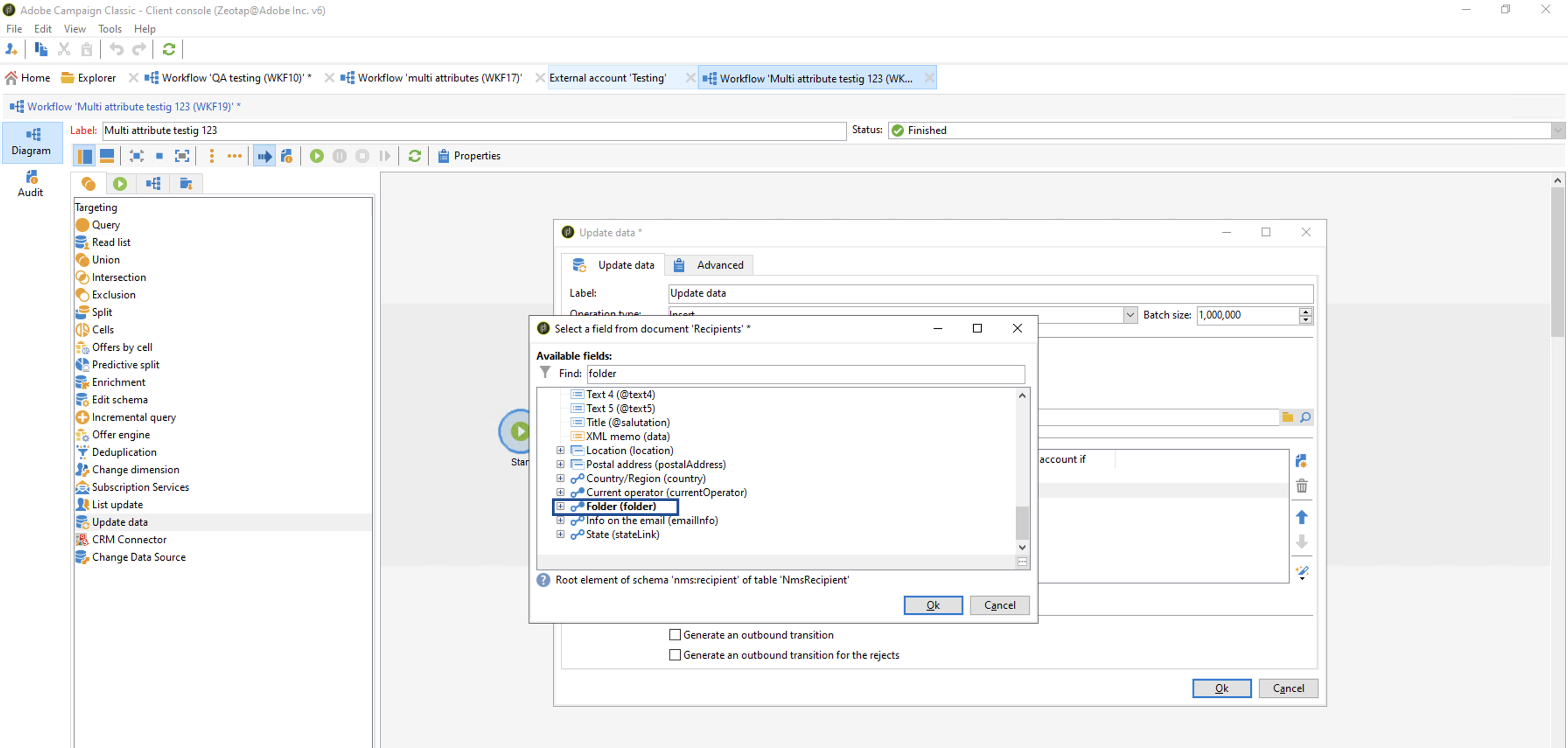 Use case 1 - Updating data containing only email addresses. Click Update Dataon the workflow diagram and perform the following configurations in the Update data tab:Under Fields to update, add the email addresses and folders. To do so, use the New icon shown in the image below.