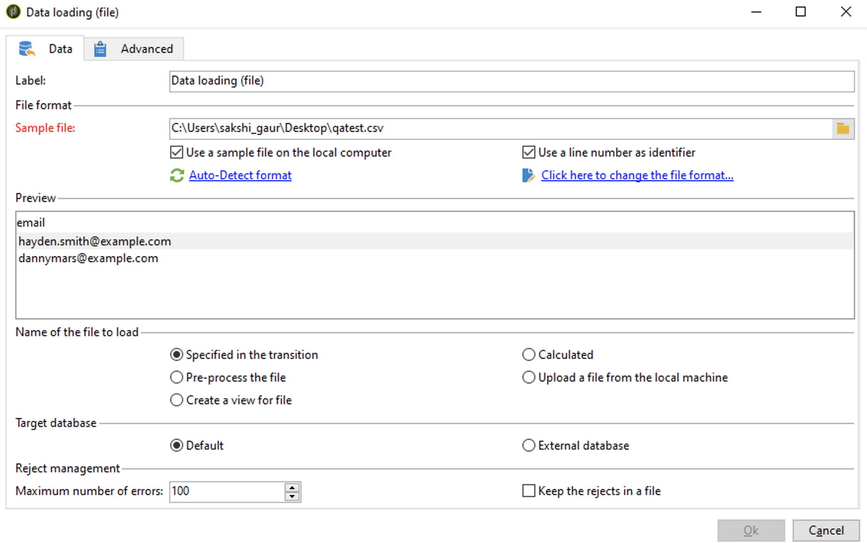 Use case 1- Loading data containing only email addresses Click Data loading (file) on the workflow diagram and perform the following configurations in the Data tab:Provide the path of the sample CSV file, which contains sample email addresses from your local drive.