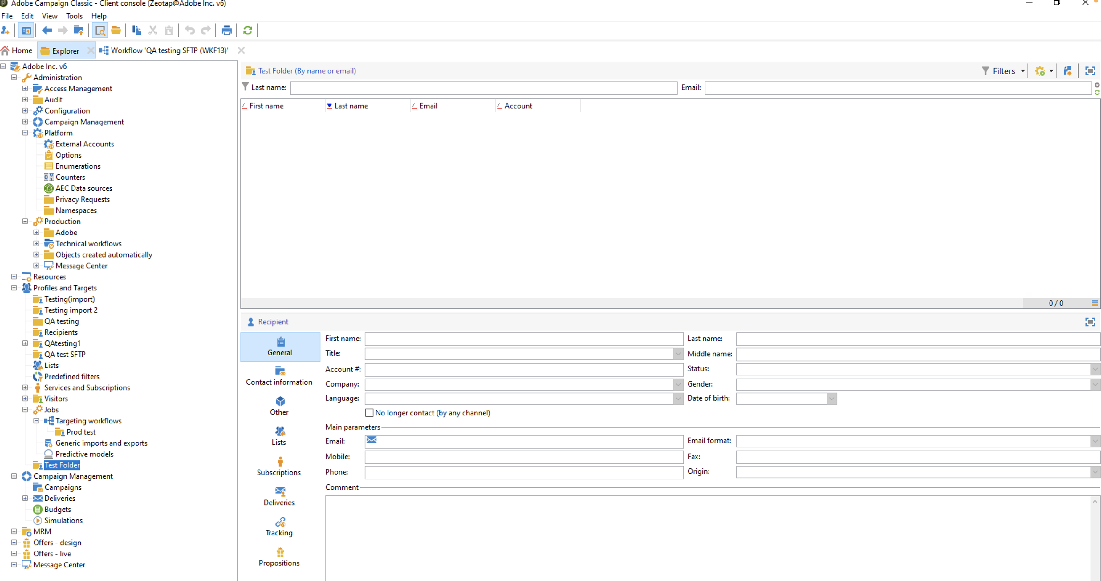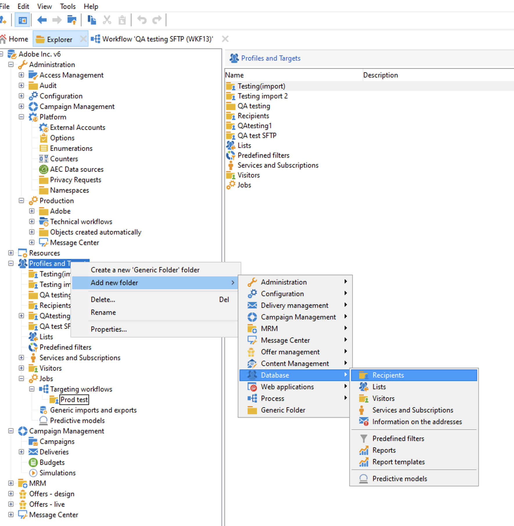 Under Explorer, navigate to Profiles and Targets > Add new folder > Database > Recipients.