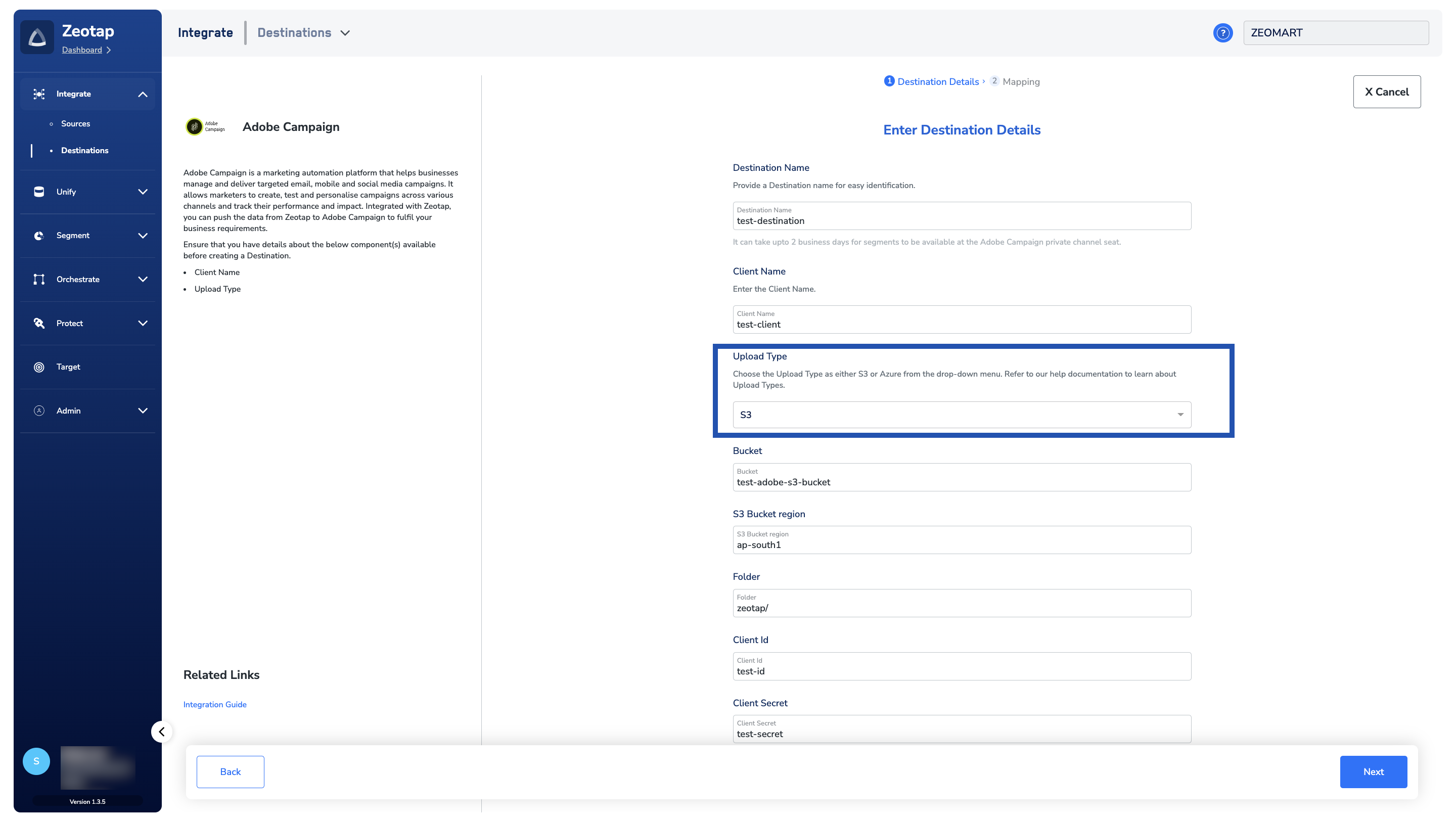 a. Enter a name for the Destination.b. Provide the Client Name.c. Choose the Upload Type from the drop-down menu. This integration supports the following Upload Types: