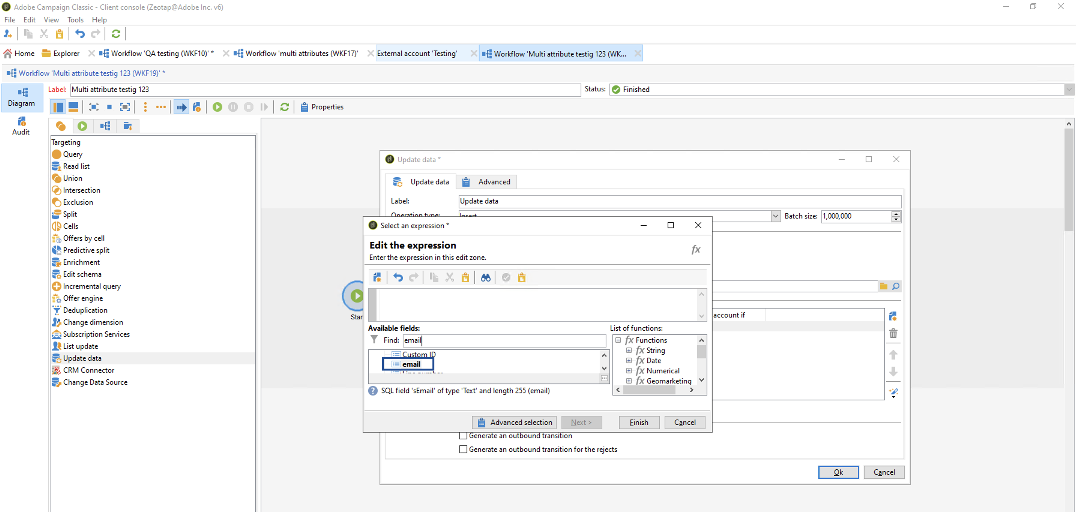 iv. In the following Select an expression window that appears, under Available fields search for email, double click email and click Finish.
