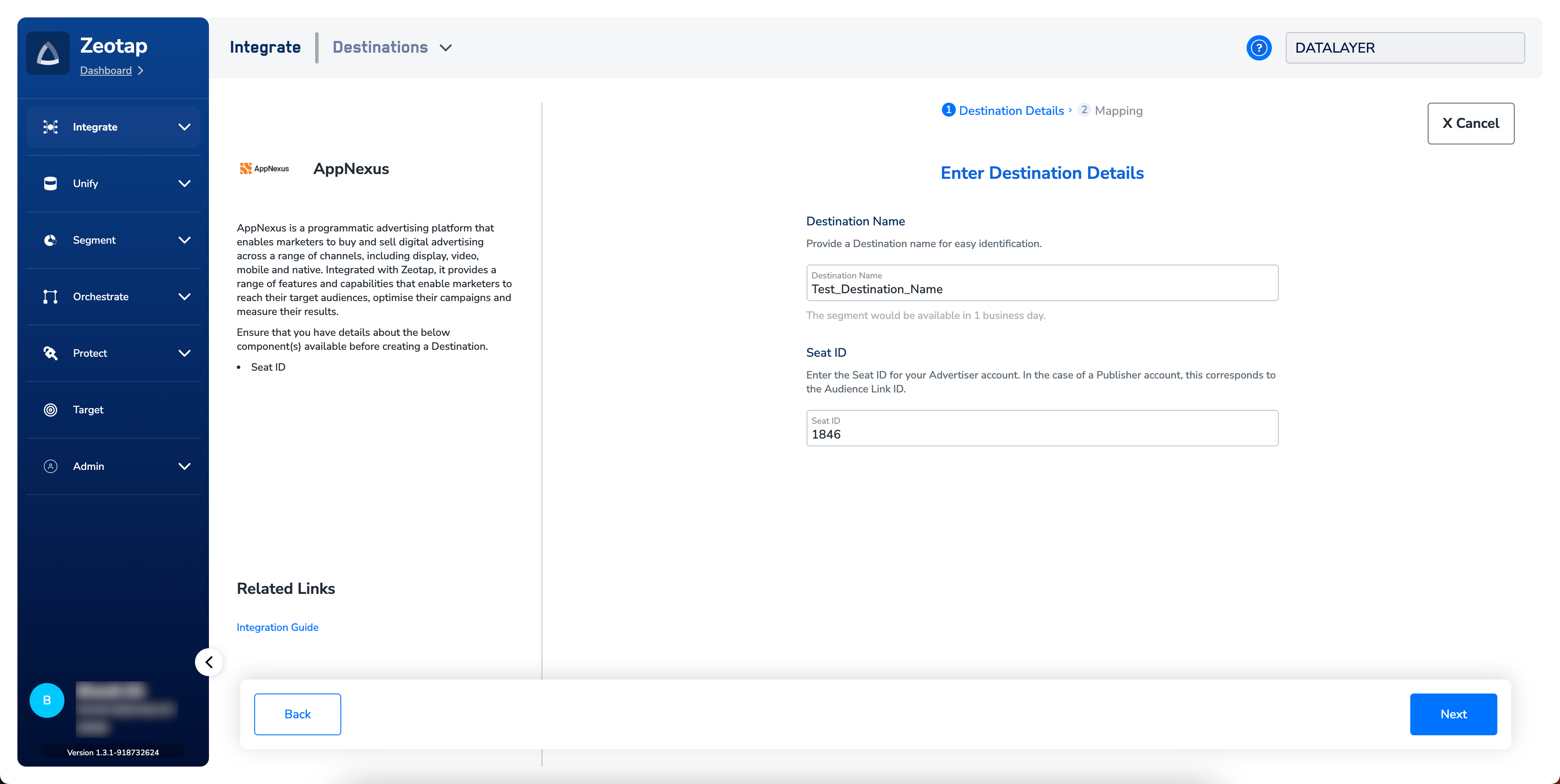 Perform the following steps to create a destination for AppNexus:Click AppNexus. A screen appears displaying details about the particular destination towards the left. On the right-hand side of the screen find a list of fields that are required for the integration to be established. Enter the required details as mentioned in the following steps:a. Enter a name for the Destination.b. Enter the Seat ID number on which the client has requested the Audience/Segment.c. Review all the values entered above and then click Next to proceed.