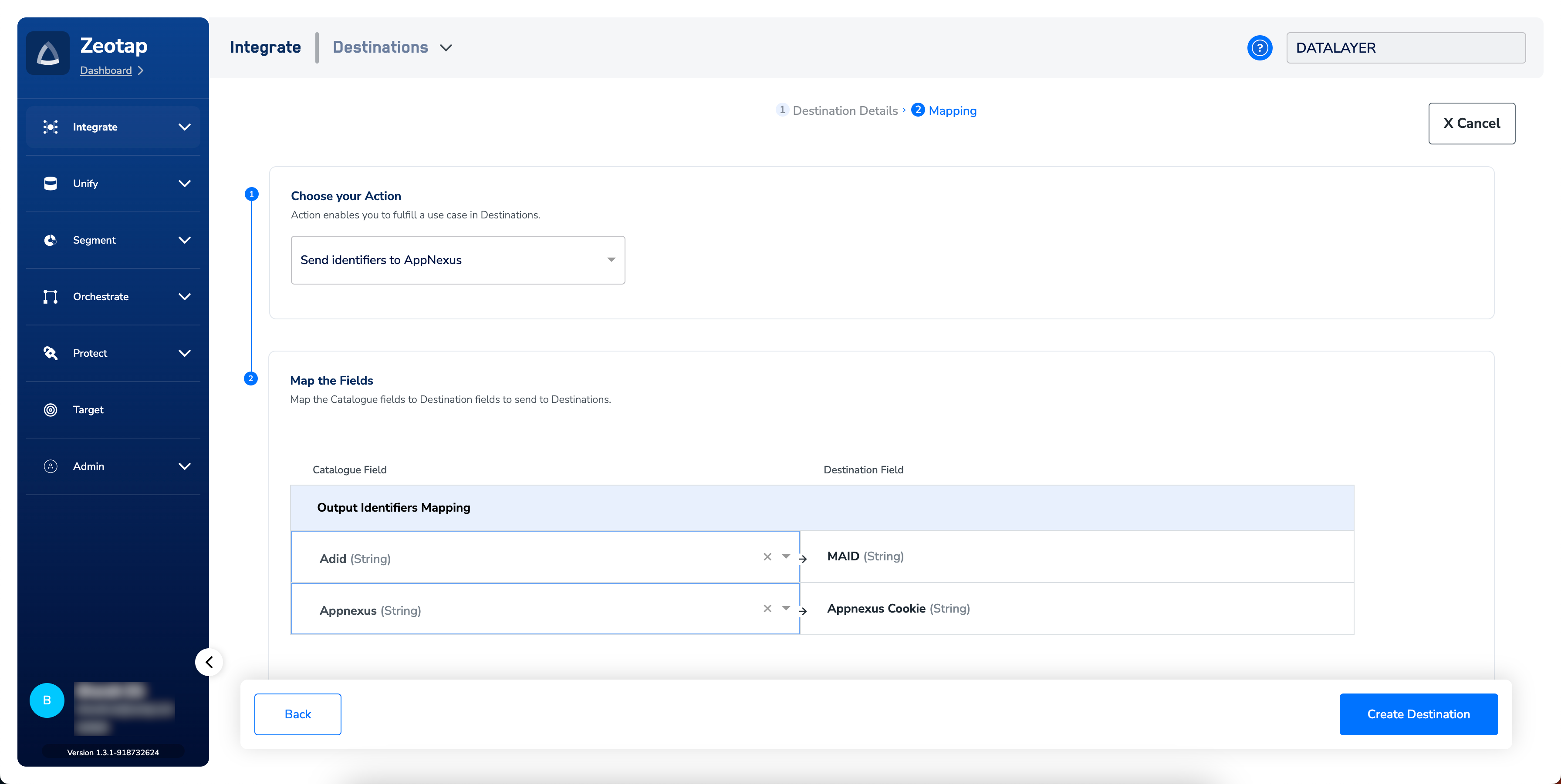 In the new screen that appears, choose the appropriate Action and mapping as explained below.a. Choose the desired action under Choose your Action and then choose the corresponding identifiers under Map the Fields. By default, the Output Identifiers that are accepted by the platform such as, MAIDs, Cookies, email Ids and more are displayed. However, you can edit, add or remove an identifier from the list. To do so, refer here.b. Click Create Destination. The created Destination gets listed in the Target and Audiences applications, which can be linked to an Audience/segment.