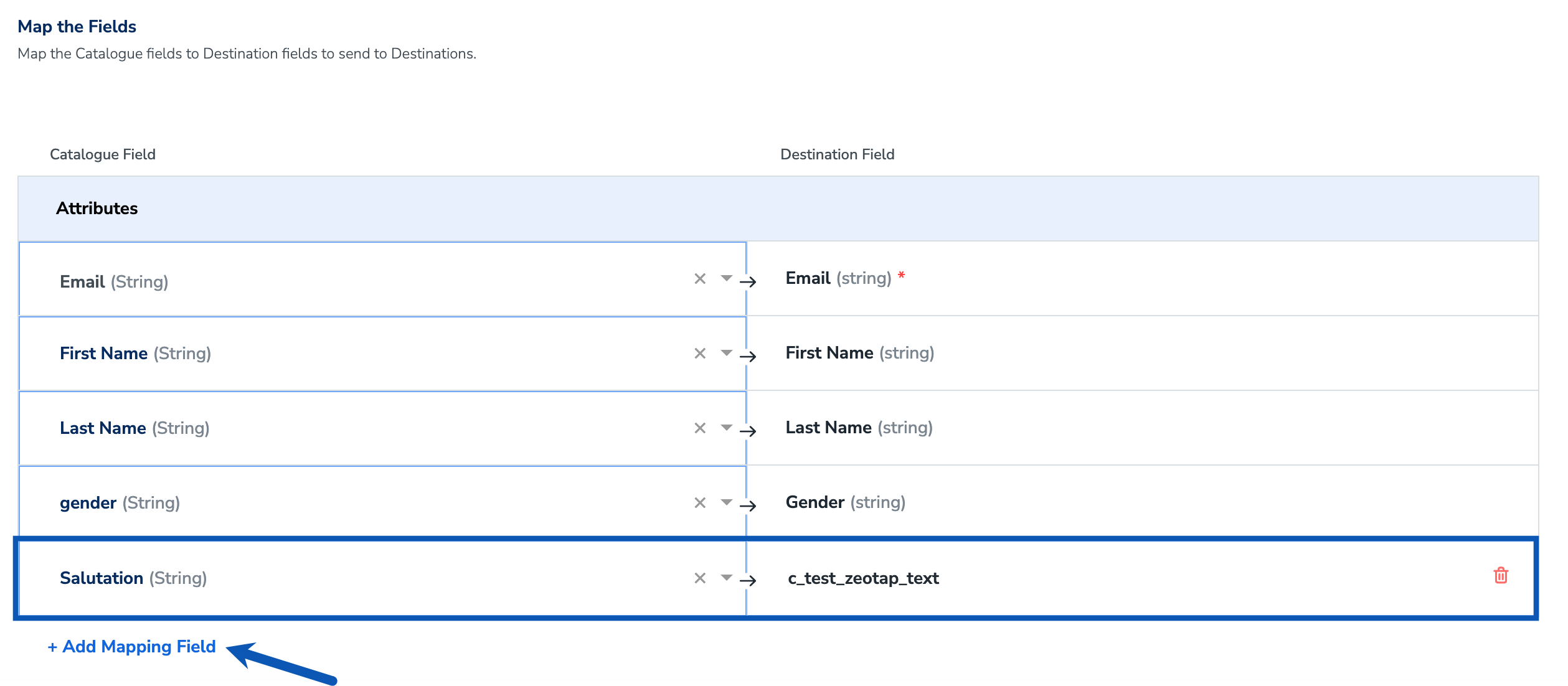 c_ or e_) into the Destination Field column when configuring it in Zeotap CDP. To identify the variable field names in Elaine, refer to the steps outlined below.i. Log into Elaine and navigate to the global folder or the relevant folder where the custom field is located.ii. Select Data Fields and review the list of available fields in the folder.iii. Click on the field you want to map in Zeotap CDP.iv. In the Characteristics section, locate the “Variable” field (usually starting with c_ or e_). In the below example, the variable name for the custom field added in Elaine is c_test_zeotap_text. Copy this value and enter it in the Destination field text box on the mapping screen in Zeotap CDP as shown below.