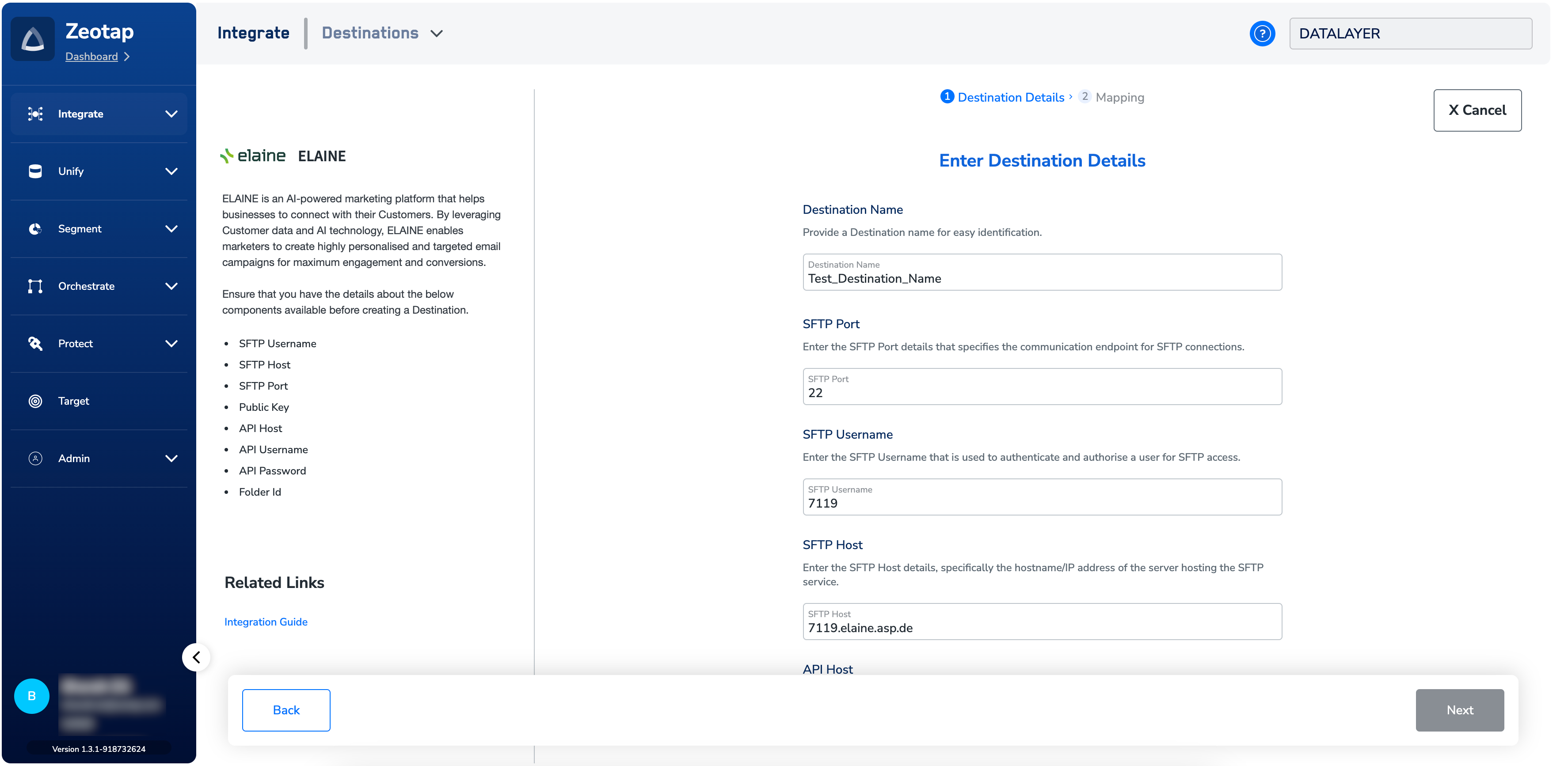 Perform the following steps to create a Destination for ELAINE:Click ELAINE. A screen appears displaying details about the particular destination towards the left. On the right-hand side of the screen find a list of fields that are required for the integration to be established. Enter the required details as mentioned in the following steps:a. Enter a name for the Destination.b. Enter the SFTP Port, SFTP Username and SFTP Host.c. Enter the API Host, API Username and API Password.d. Enter the Folder Id.e. Ensure that the Public Key is registered within the SFTP server.f. Review all the values entered above and then click Next to proceed.