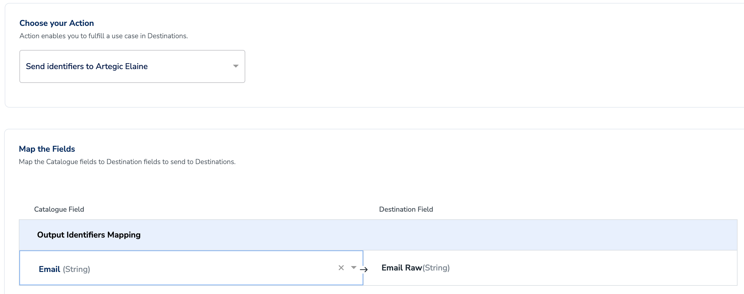 In the new screen that appears, under Choose your Action, you can either choose Send identifiers to ELAINE or Send attributes and identifiers to ELAINE based on your requirement and map the relevant Catalogue fields to the Destination fields.a. Send identifiers to ELAINE allows you to send Email Addresses (raw) only.