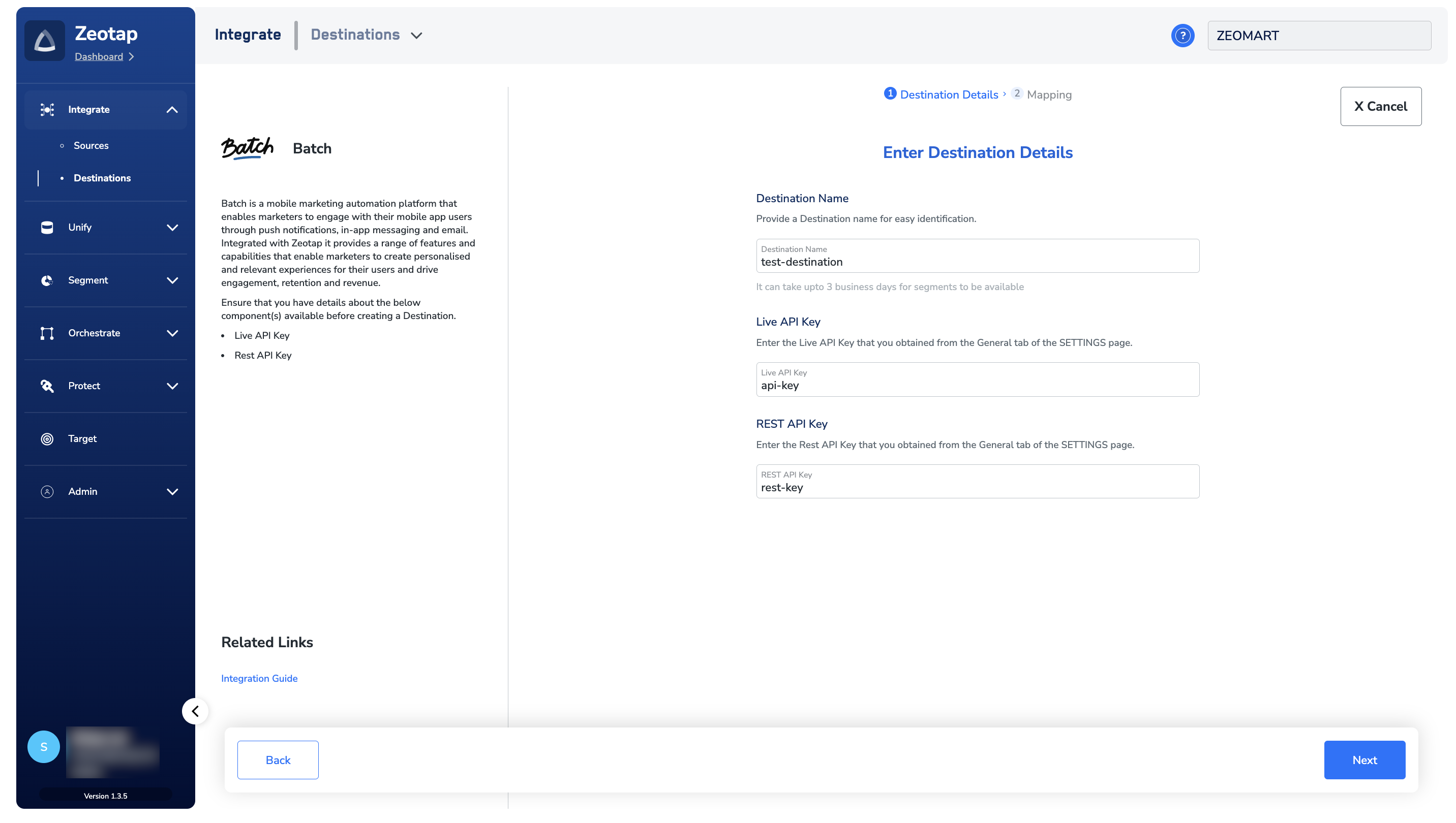 Perform the following steps to create a Destination for Batch:Click Batch. A screen appears displaying details about the particular destination towards the left. On the right-hand side of the screen find a list of fields that are required for the integration to be established. Enter the required details as mentioned in the following steps:a. Enter a name for the Destination.b. Enter the Live API Key and the REST API Key.c. Review all the values entered above and then click Next to proceed to mapping.
