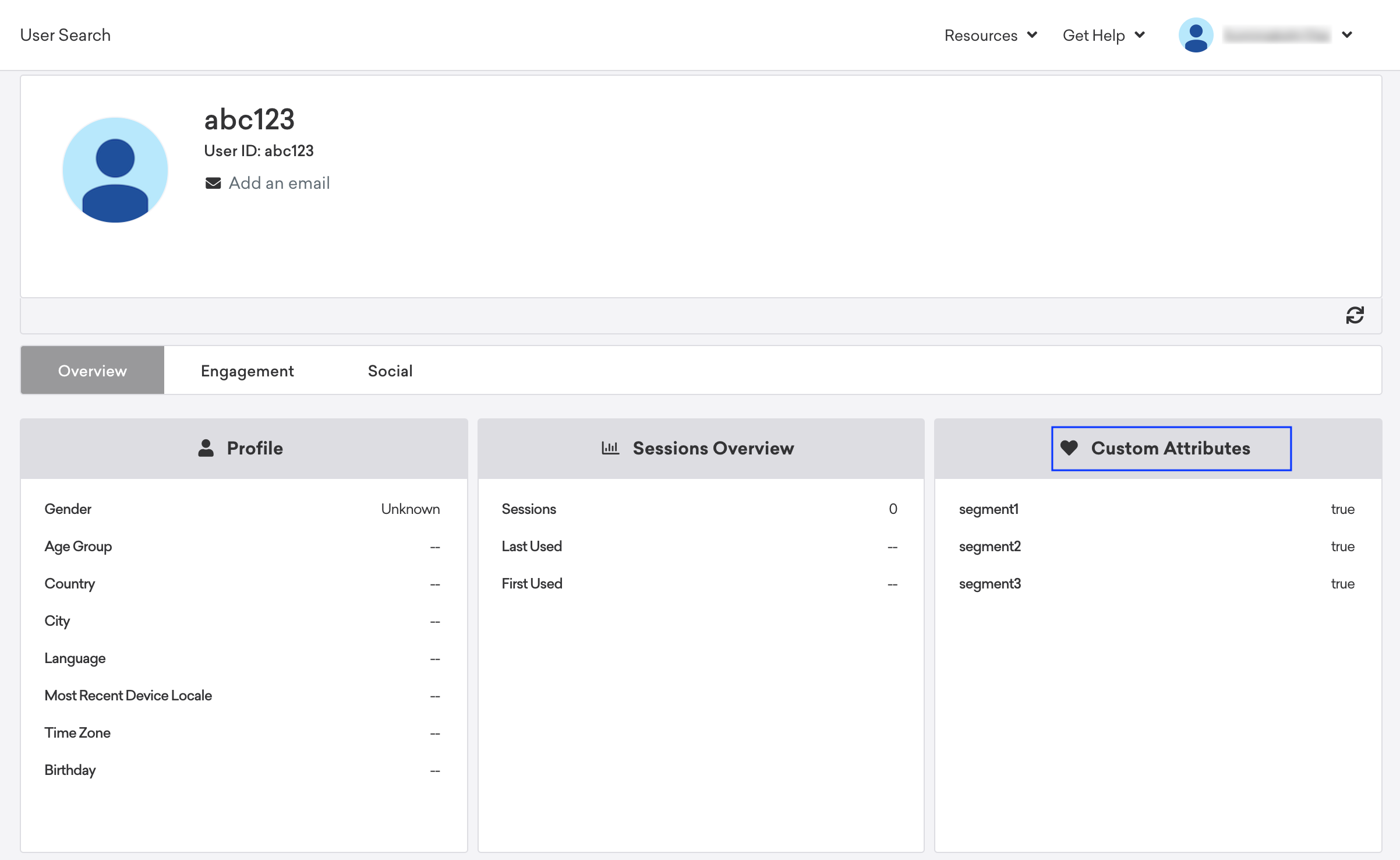After you have successfully created a segment and the data is pushed and processed, the data appears on Braze console. You can search by Email ID on the Braze console. You can view the Custom Attributes associated with the User Profile. The Custom Attributes section provides a list of segment names created in Audiences, and the relevant Boolean value true indicating that the user is a part of the particular segment.