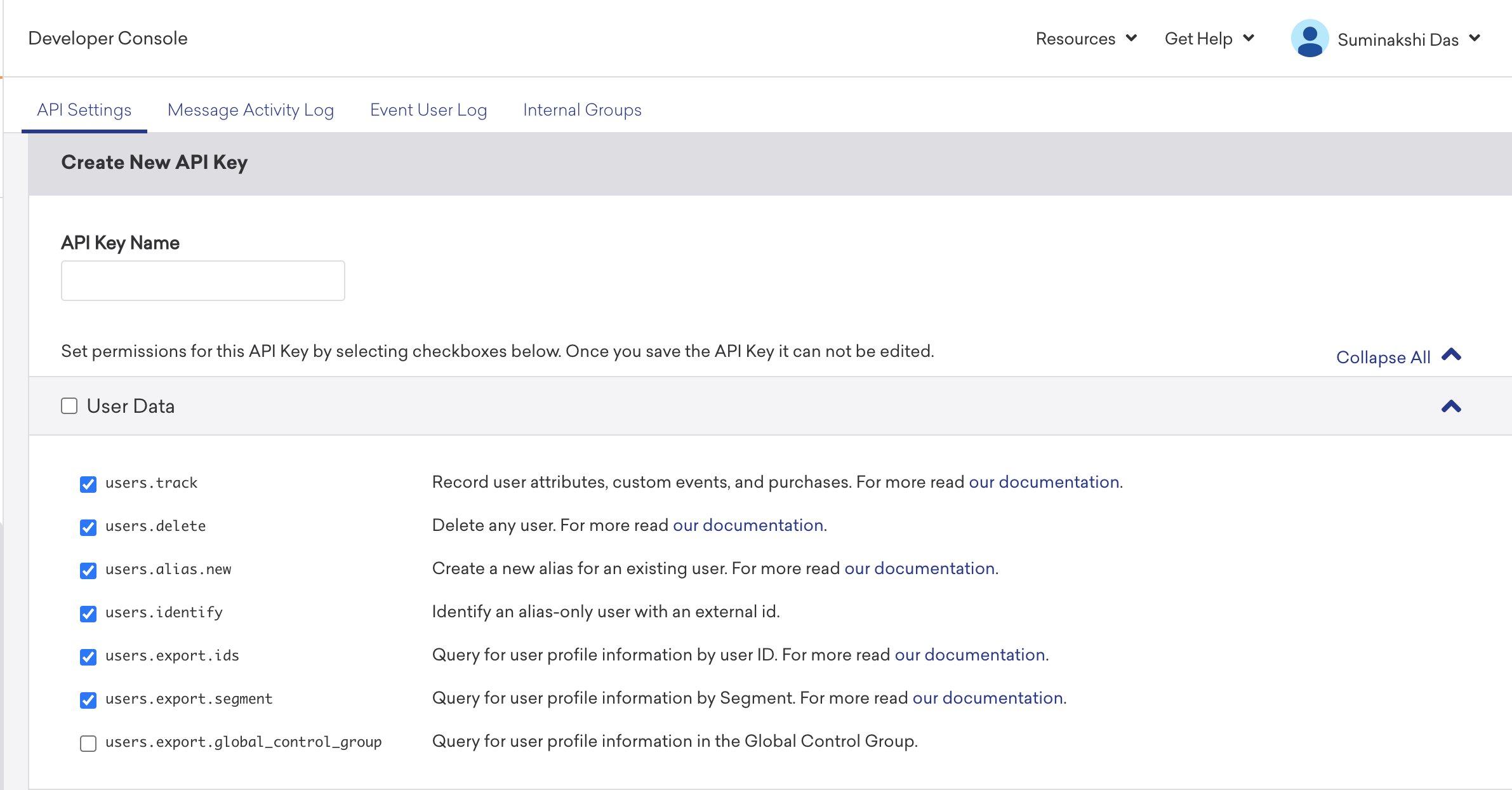 This is the API Key associated with the Braze account. You can find it in the Braze Console under Settings → Developer Console → Rest API Keys. Your account might already have an existing API key available in this section. However, the User Data Permissions are required for the API key to work. If the existing key does not have the required permissions, create a new key as mentioned below.Instance