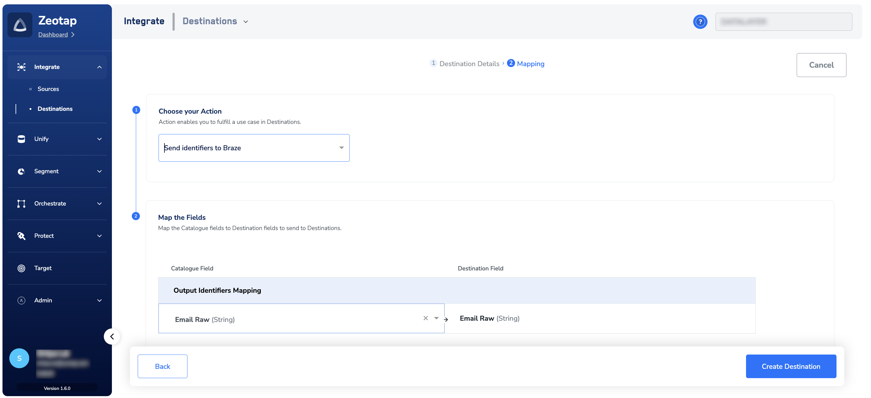 In the new screen that appears, choose the appropriate Action and mapping as explained below. Under Choose your Action, you can either choose Send attributes and identifiers to Braz e or Send identifiers to Braze as the action.a. Choose Send attributes and Identifiers to Braze as the action to send the output identifiers such as, Email addresses, First Name, Last Name and Gender. Here, you are allowed to map attributes and identifiers from the Catalogue fields to the corresponding Destination fields.