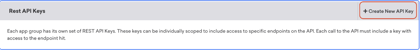 This is the API Key associated with the Braze account. You can find it in the Braze Console under Settings → Developer Console → Rest API Keys. Your account might already have an existing API key available in this section. However, the User Data Permissions are required for the API key to work. If the existing key does not have the required permissions, create a new key as mentioned below.- Click Create New API key.