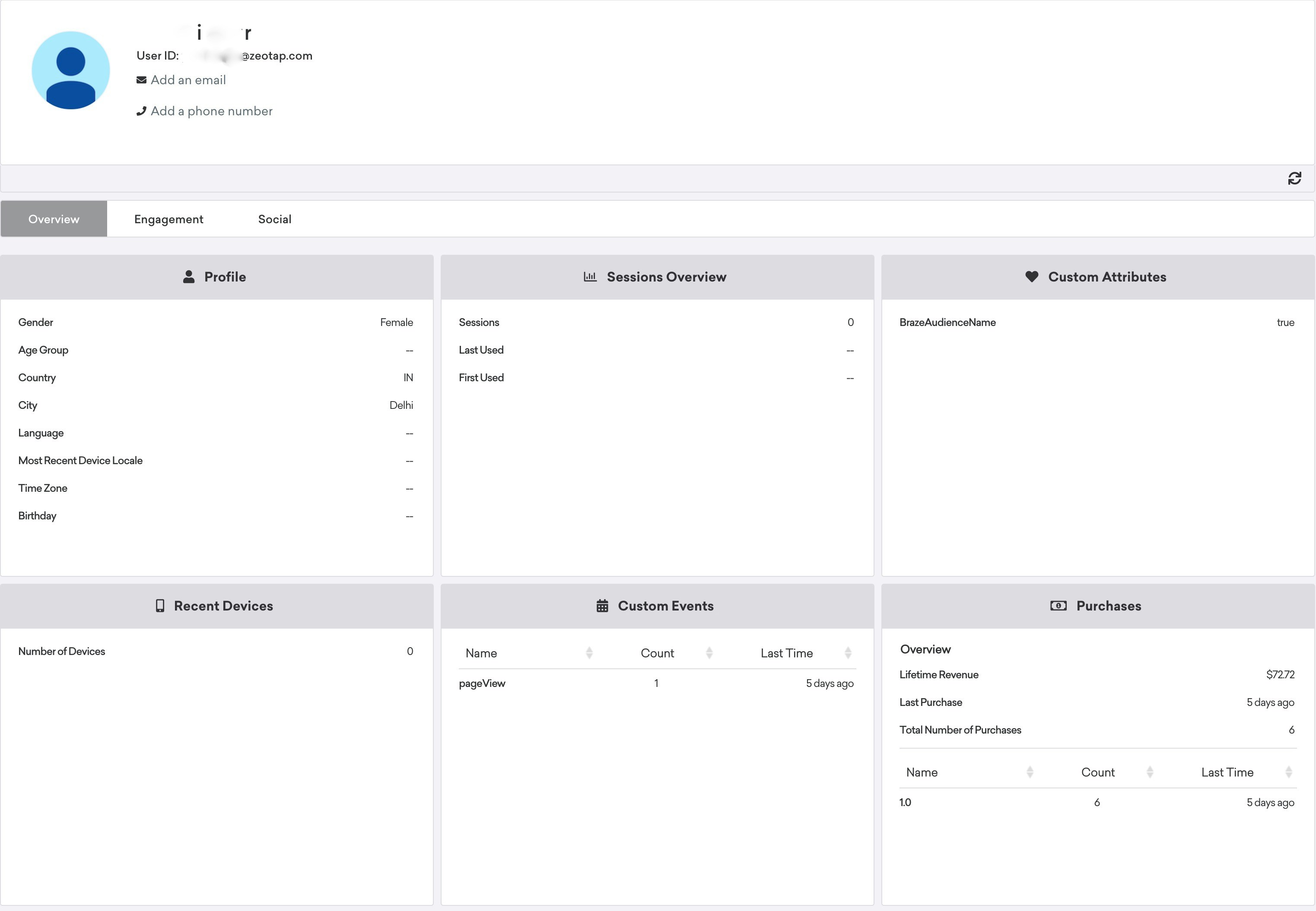 After you have mapped the relevant attributes to be sent and published the workflow, the events start flowing to Braze based on the criteria defined. You can search by Email ID/External ID on the Braze console. The user dashboard appears as shown below.