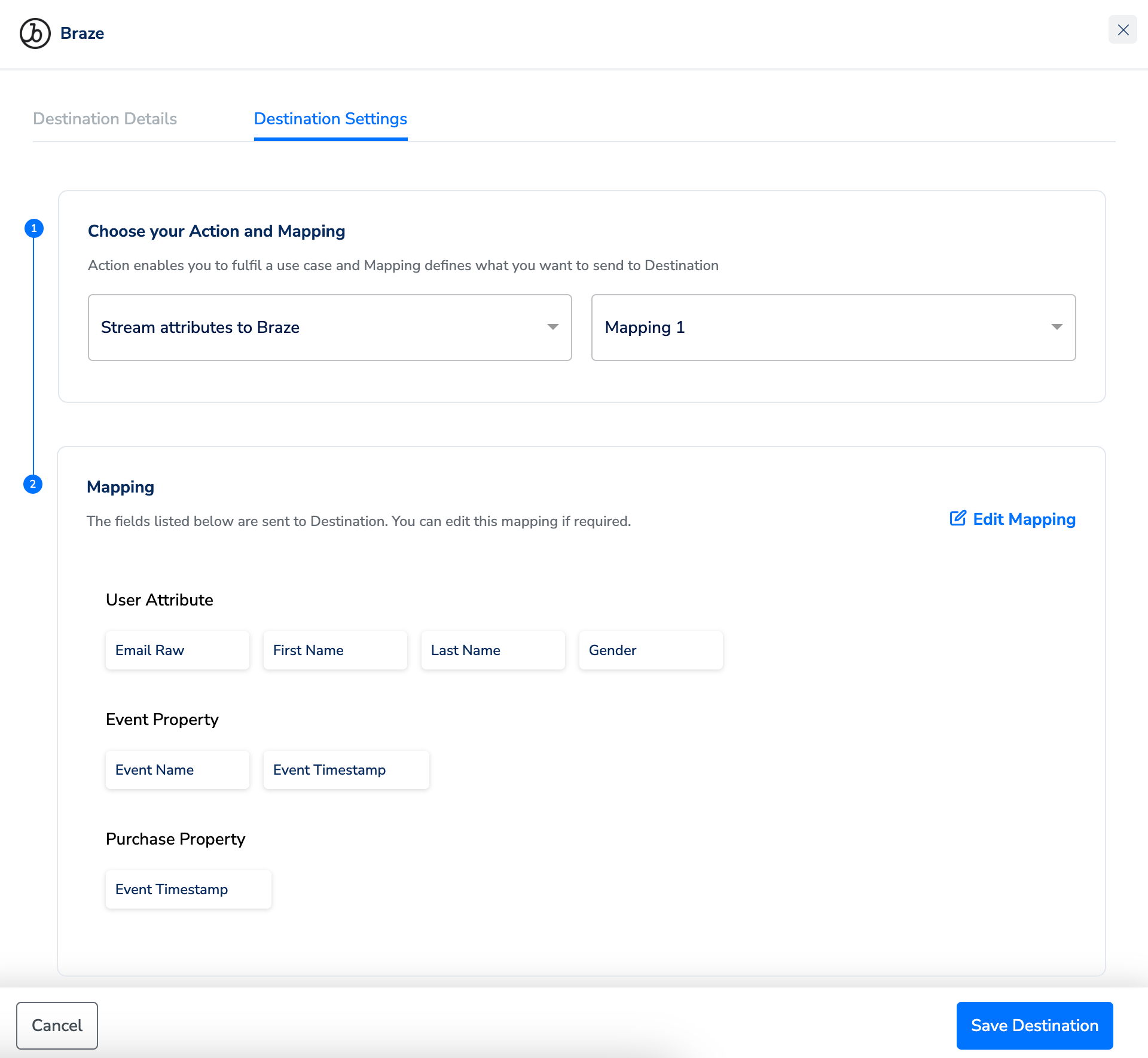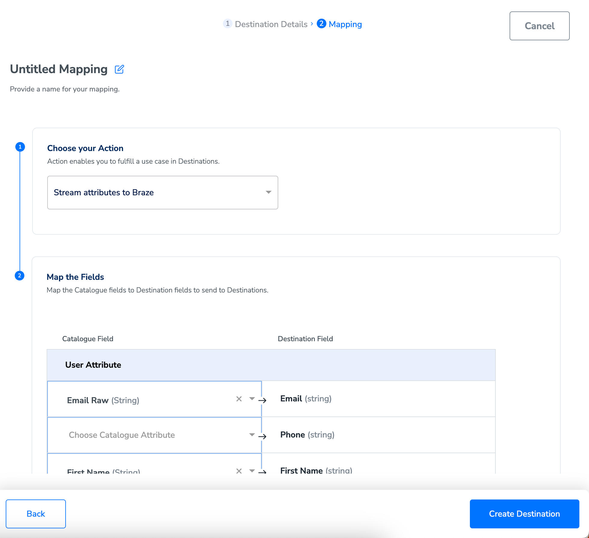 Perform the following steps to add a new destination:In the mapping screen that appears, under Choose your Action, select Stream attributes to Braze as the action for sending data from the workflow created in Journeys. Under Map the Fields, Zeotap CDP automatically maps certain fields to the relevant Braze fields like Email, Phone, First Name, Last Name and so on. You can edit or remove the mapping as per your requirement.You can also add custom data that can be mapped to the relevant Zeotap field and sent to Braze. You can include custom data as an Event Property, User Attribute or Purchase Property. For example, when sending an event related to renting a movie, you can provide additional event details such as the platform of release, the year it premiered, cast information and more. This allows for a more comprehensive and specific data representation that can now be achieved through Event Property. Similarly, you can send User Attribute and Purchase Property as well.Note that you can only send simple key-value pairs through these fields. For instance, if a customer purchases Nike shoes on Amazon, using a specific email ID and USD as the currency, the associated purchase properties can include key-value pairs like, color: red, checkout duration: 180 seconds, size: 10 UK, brand: Nike and so on.