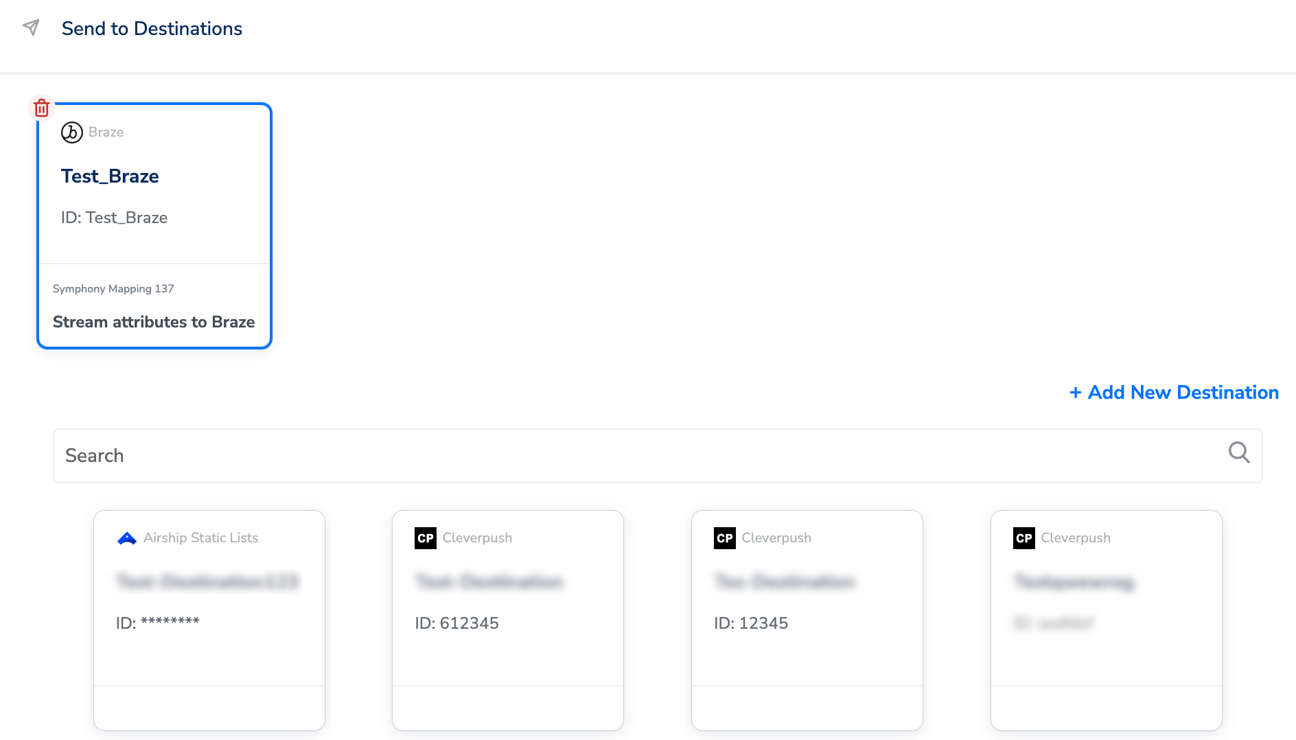 After you have applied filters or added conditions for your users in Journeys, you can activate them in Braze under Send to Destinations. A new window appears, where you can set up your destination. You can use an already existing destination from the list of available Destinations or create a new one by clicking + Add New Destination.