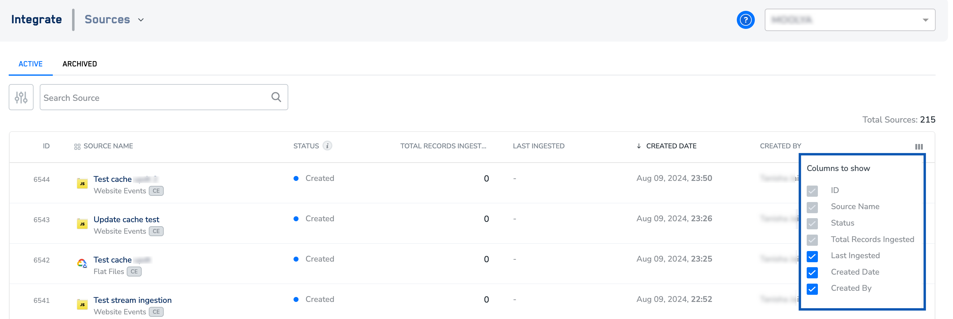 | STATUS | The status of a source. The following are the available statuses: Created – Indicates that the source has been created in Sources, but it is yet to receive any data. Integrated – Indicates that the data has started flowing into the source, but the taxonomy standardisation is yet to be applied. At this point, you can preview the incoming data through the PREVIEW DATA tab of the particular source. Mapped – Indicates that the data collection(s) are created on top of an integrated source based on the common taxonomy. This means that at least one data collection exists for this source. Archived – Indicates that the source is archived for future ingestion. To know more about archived sources, refer to Archived Source. Paused – Indicates that the source is paused temporarily for both data collection and ingestion. Paused (Collection) – Indicates that the source is paused temporarily for data collection. Paused (Ingestion) – Indicates that the source is paused temporarily for data ingestion. |