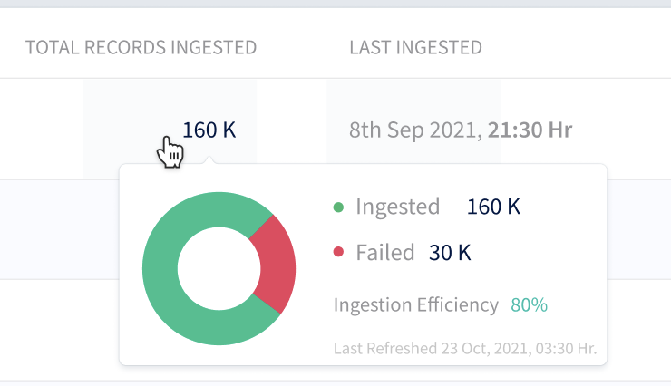 | TOTAL RECORDS INGESTED | The total record count of the data ingested and are available for activation from this source. On hovering over the number, a pie chart appears with the following details: Ingested – The total number of records ingested and are available for activation. Failed – The records that failed to ingest during ingestion. Ingestion Efficiency – The percentage of the total records ingested versus the total records received (for the ingested records). Last Refreshed Date – The last date and time when this information in the pop-up was updated. ![]() Note: The data displayed here is for the lifetime of the source. This means that the data displayed here is from the time the source was created in Zeotap. |