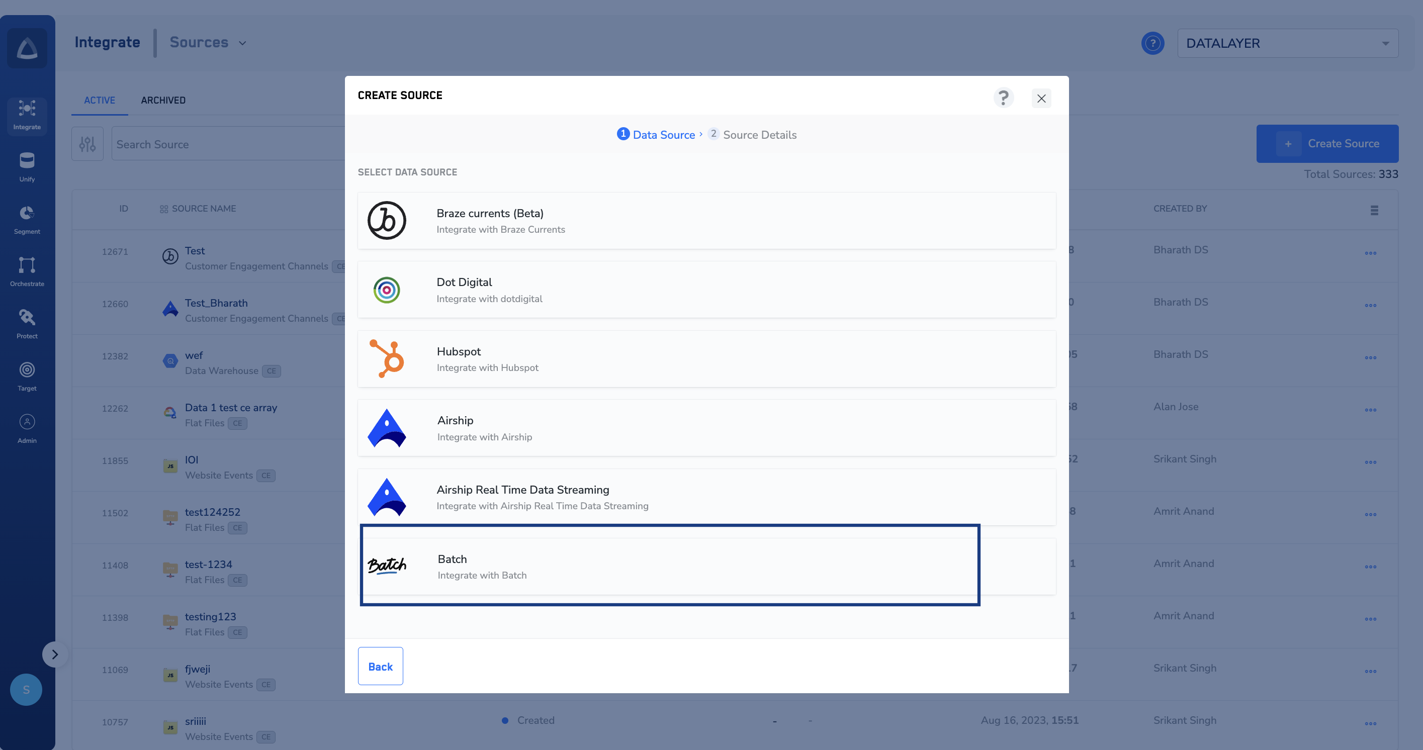 Perform the following steps to establish a connection with Batch by using their built-in connector through Sources:In the window that appears, provide the following details:a. Enter a name for the Source.b. Enter the Rest API Key and Live API Key that you obtained from Batch.c. Under Data Entity, depending on the type of data that you want to ingest, choose either Customer Data or Non Customer Data and proceed with the source creation. To know more about Customer Data and Non Customer Data, refer here.d. Select the Region of upload.e. Choose the desired Sync Frequency from the drop-down list. The first data sync takes place once you create the source. However, the subsequent syncs take place based on the sync frequency that you select. Currently, we support the following sync frequencies: