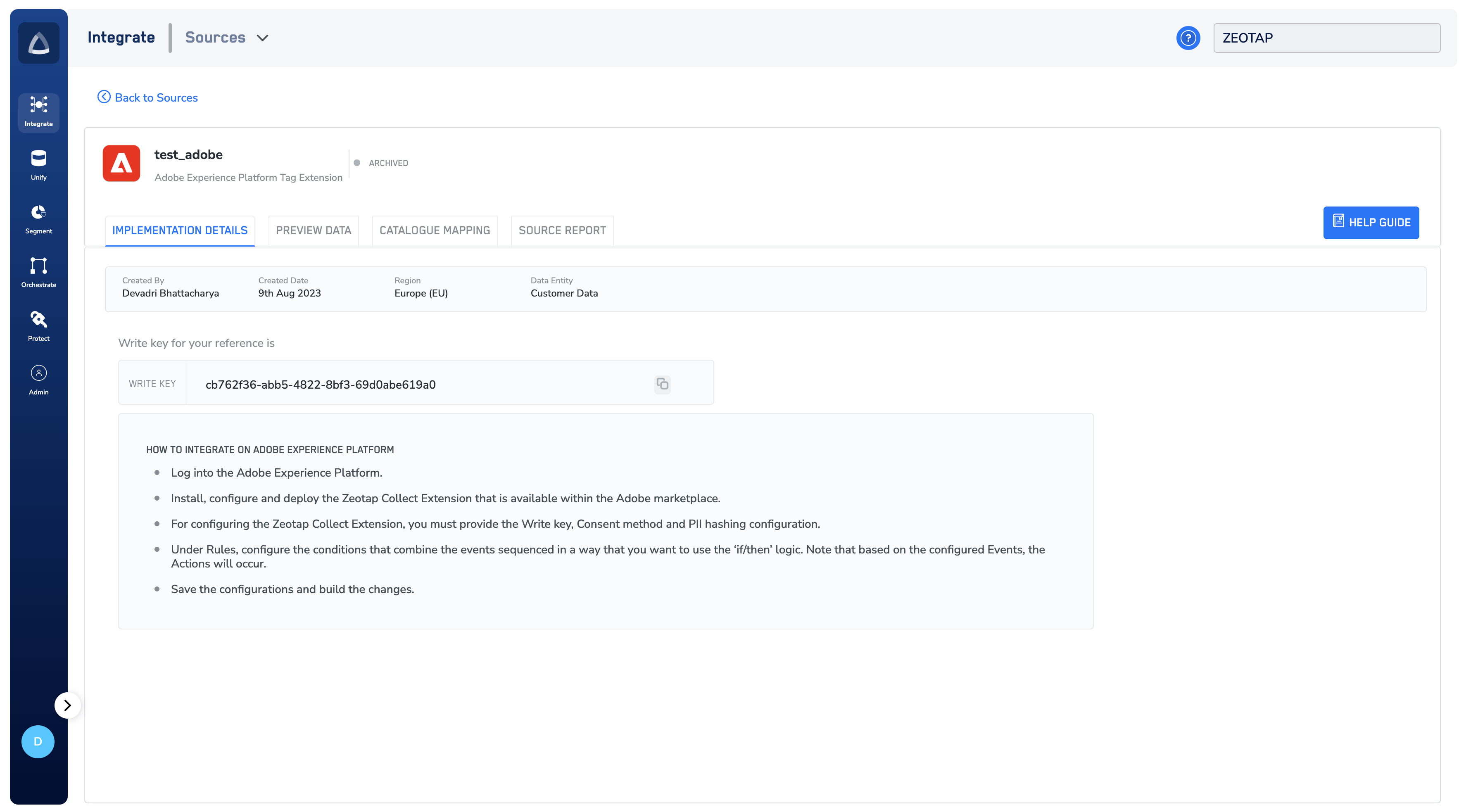 Note:When you create an Adobe Experience Platform Tag Extension source in your Collect account, a Write key is autogenerated by the system. Provide this key for configuring the Zeotap Collect Extension in the Adobe Experience Platform. This is a mandatory field for recording events. To know more about how to implement an Adobe Experience Platform Tag Extension source, refer here.
