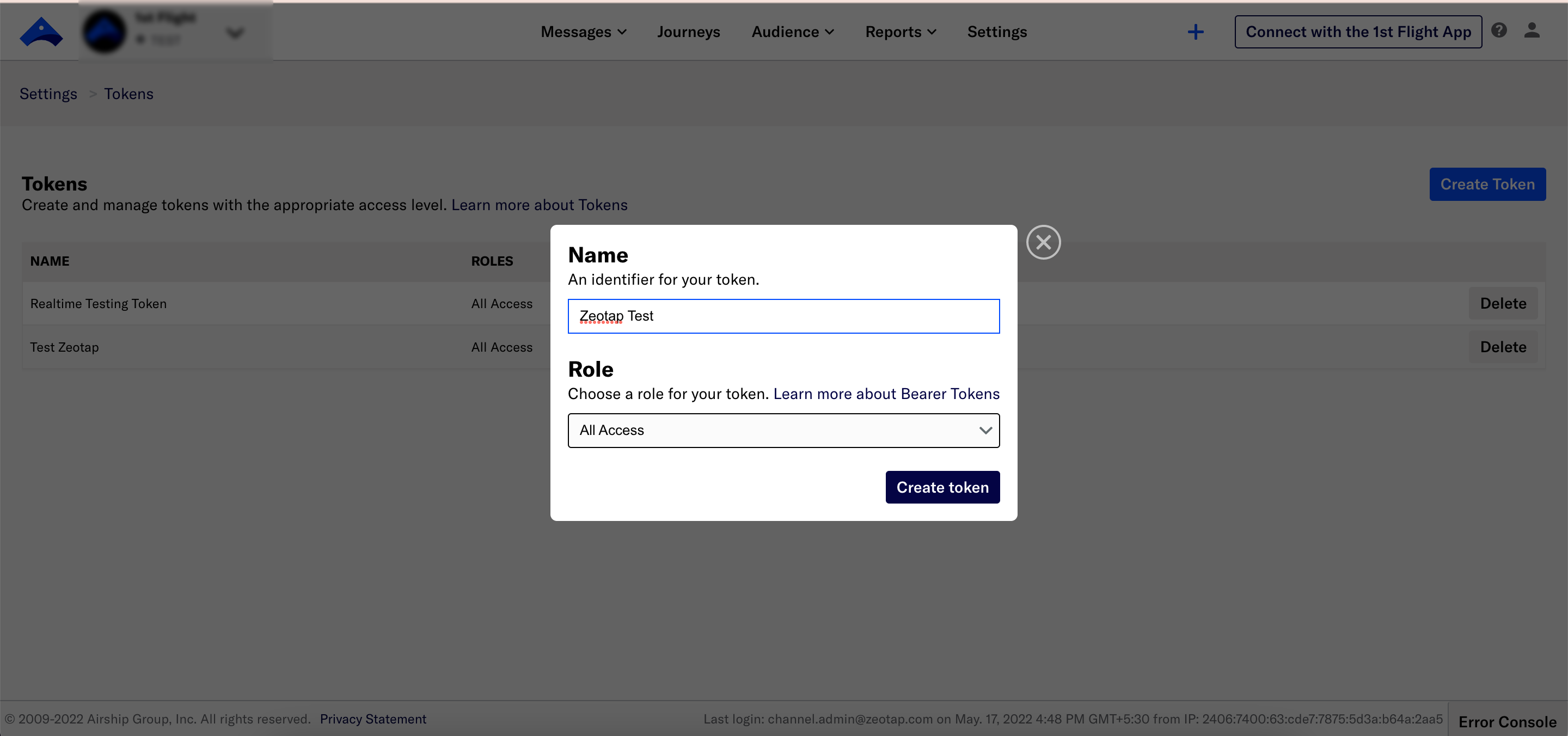 Select the Role you want to grant for this token. For additional information, see Airship API Security.