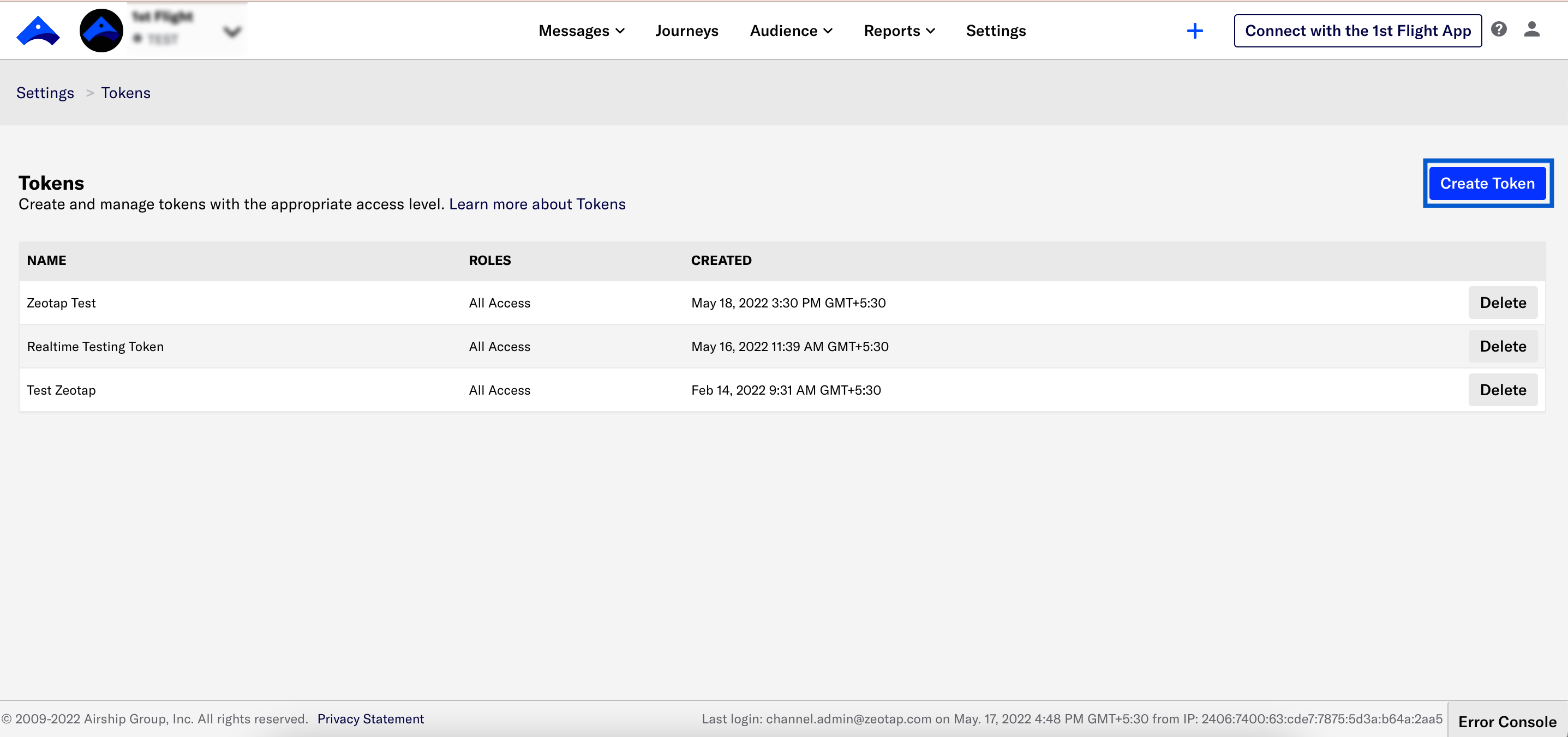 Ensure that you take care of the following prerequisites before creating an Airship (Batch) source:- Bearer Token (Access Token) – A bearer token in Airship is a unique string of characters that authenticates a user or application to access a resource. It grants limited access to a user or application for a specific period, allowing them to perform actions on behalf of the user who generated the token. Perform the following steps to create a Bearer Token in Airship.