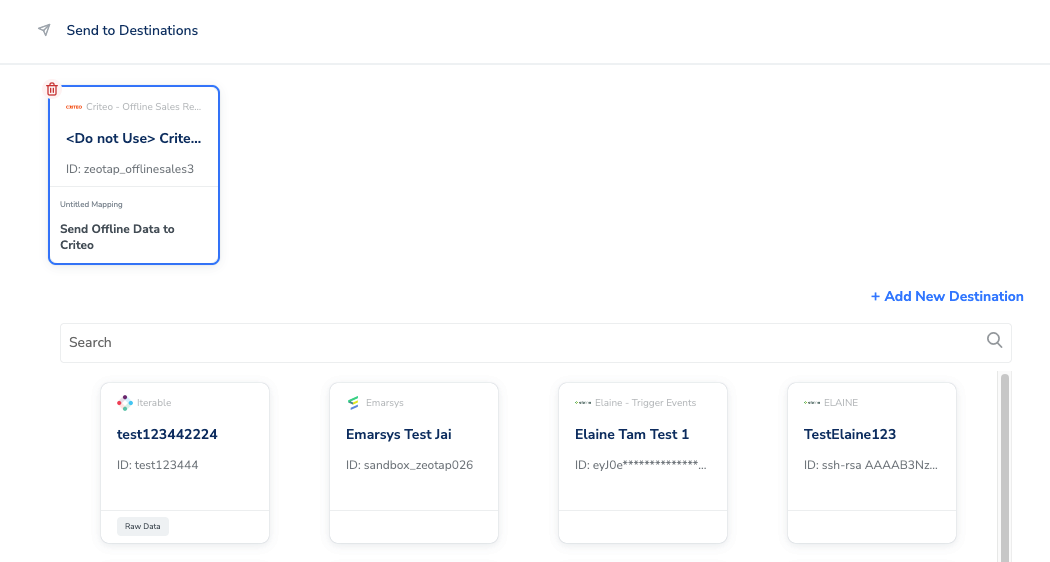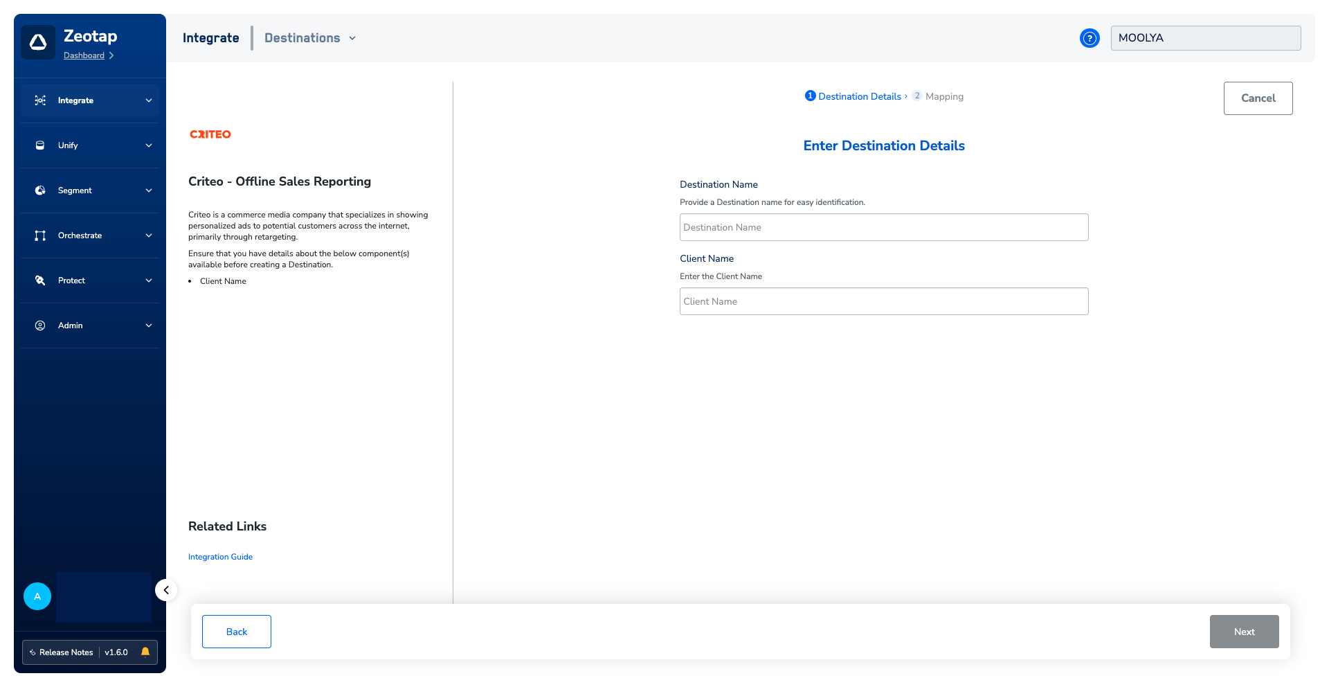 Click on Criteo Offline Sales Reporting. A screen appears displaying details about the particular destination towards the left. On the right-hand side of the screen find a list of fields that are required for the integration to be established. Enter the required details as mentioned in the following steps:a. Enter a name for the Destination.b. Enter the Client Name.