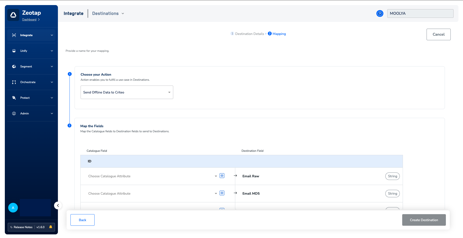 In the new screen that appears, choose the appropriate Action and mapping as explained below.a. Choose the desired action under Choose your Action and then choose the corresponding identifiers under Map the Fields. By default, the Output Identifiers that are accepted by the platform, such as email are displayed. However, you can edit, add, or remove an identifier from the list.b. Mandatory Fieldsi. Email ( Raw / MD5 / SHA256)ii. Event Idiii. Timestampiv. Item IDv. Item’s Pricevi. Item’s Quantityvii. Store IDviii. Site Typeix. IPx. User Segmentxi. Accountc. Click Save Mapping.