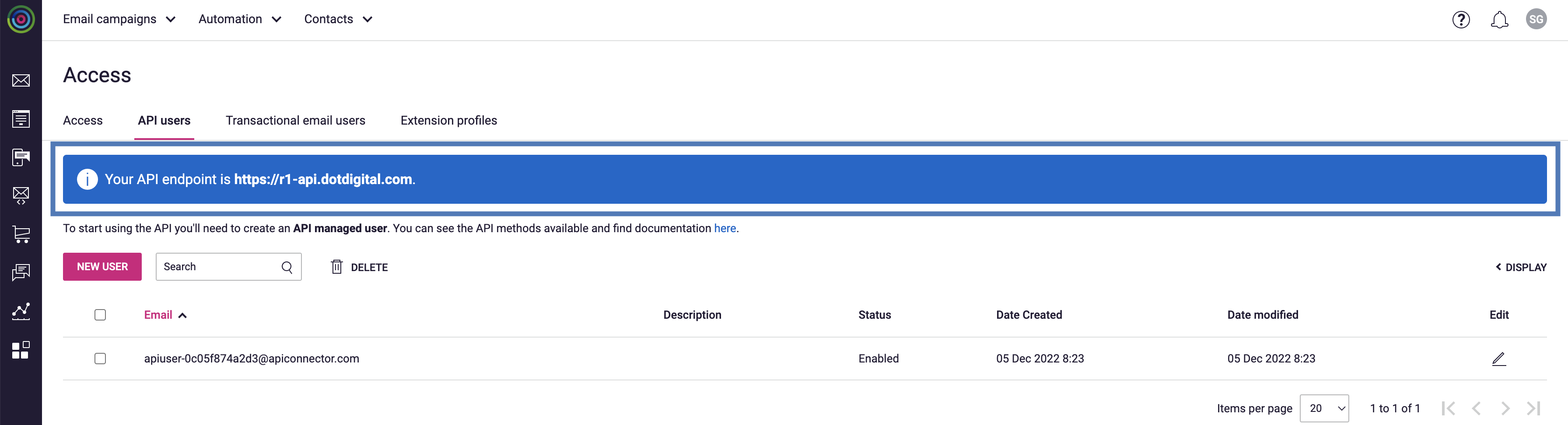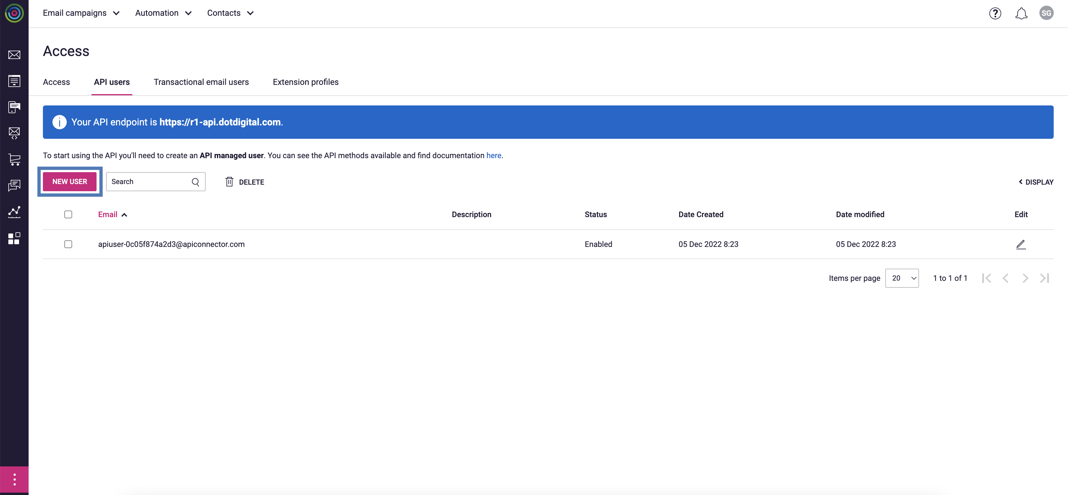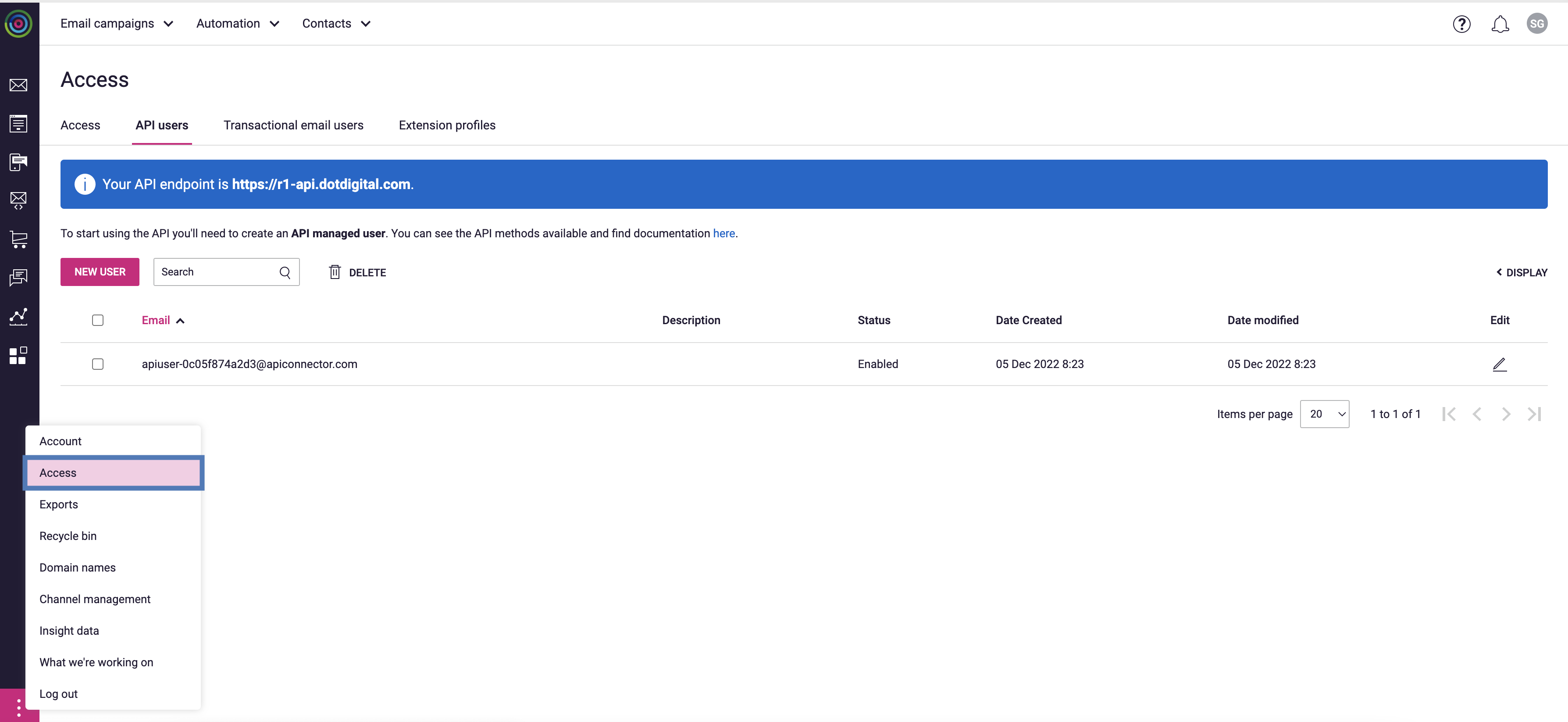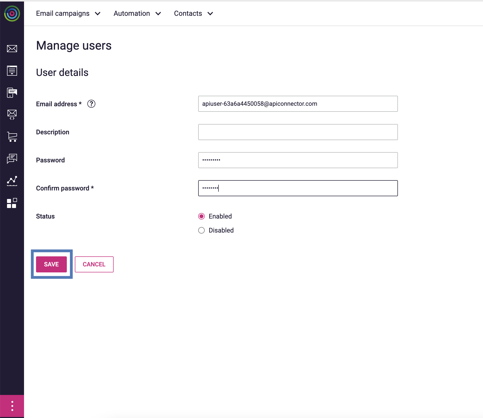 Before creating a Destination, you need to setup the API User and the corresponding password from the Dotdigital console. To do so, perform the following steps:Enter the following details for the API User:a. Email address is auto-populated.b. Enter a Password and confirm it.c. Select the Status as Enabled.