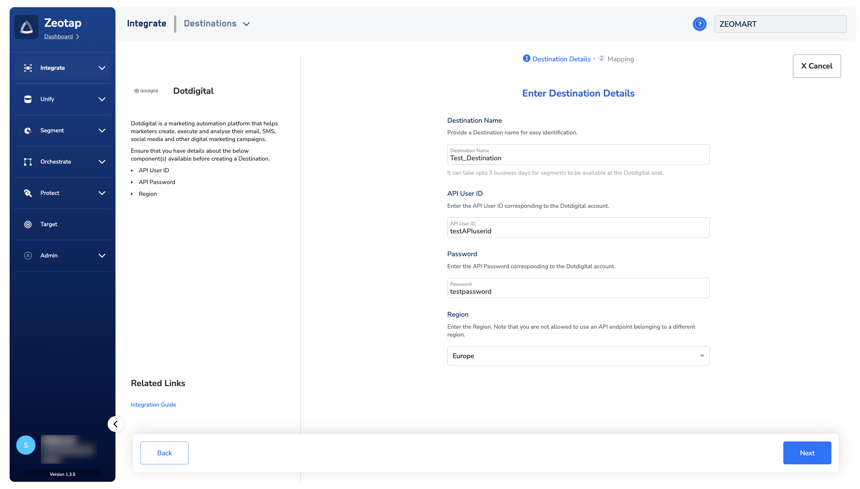 Perform the following steps to create a Destination for Dotdigital:Click Dotdigital. A screen appears displaying details about the particular destination towards the left. On the right-hand side of the screen find a list of fields that are required for the integration to be established. Enter the required details as mentioned in the following steps:a. Enter a name for the Destination.b. Enter the API User ID.c. Enter the Password that you have created while setting up the API User.d. Select the Region of your Dotdigital account using the drop-down menu.e. Review all the values entered above and then click Next to proceed.