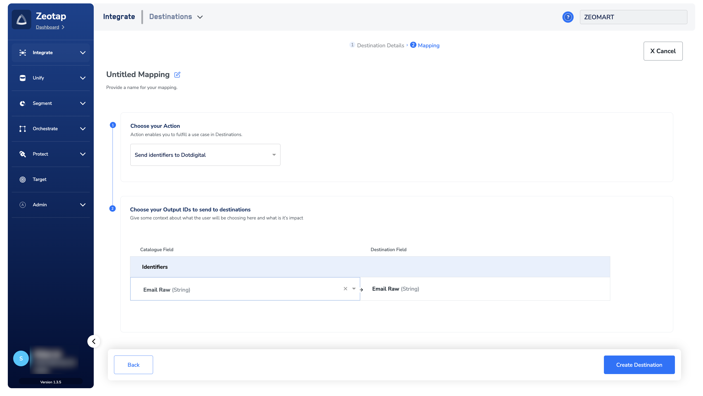 In the new screen that appears, choose the appropriate action and mapping as explained below.a. Choose the desired action under Choose your Action and then choose the corresponding identifiers under Map the Fields. By default, the Output Identifiers that are accepted by the platform such as, MAIDs, Cookies, email Ids and more are displayed. However, you can edit, add or remove an identifier from the list. To do so, refer here.b. Click Create Destination. The created Destination gets listed in theAudiencesapplication, which can be linked to an Audience/segment.