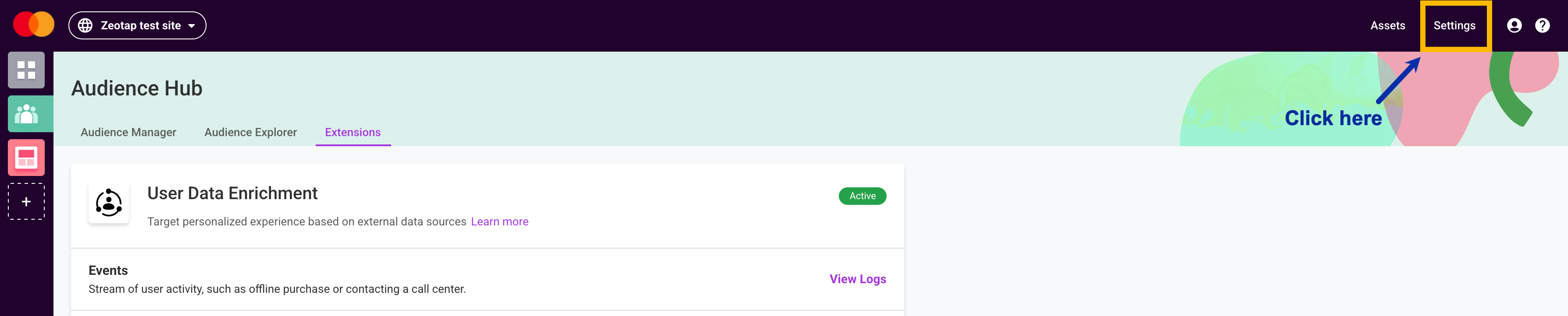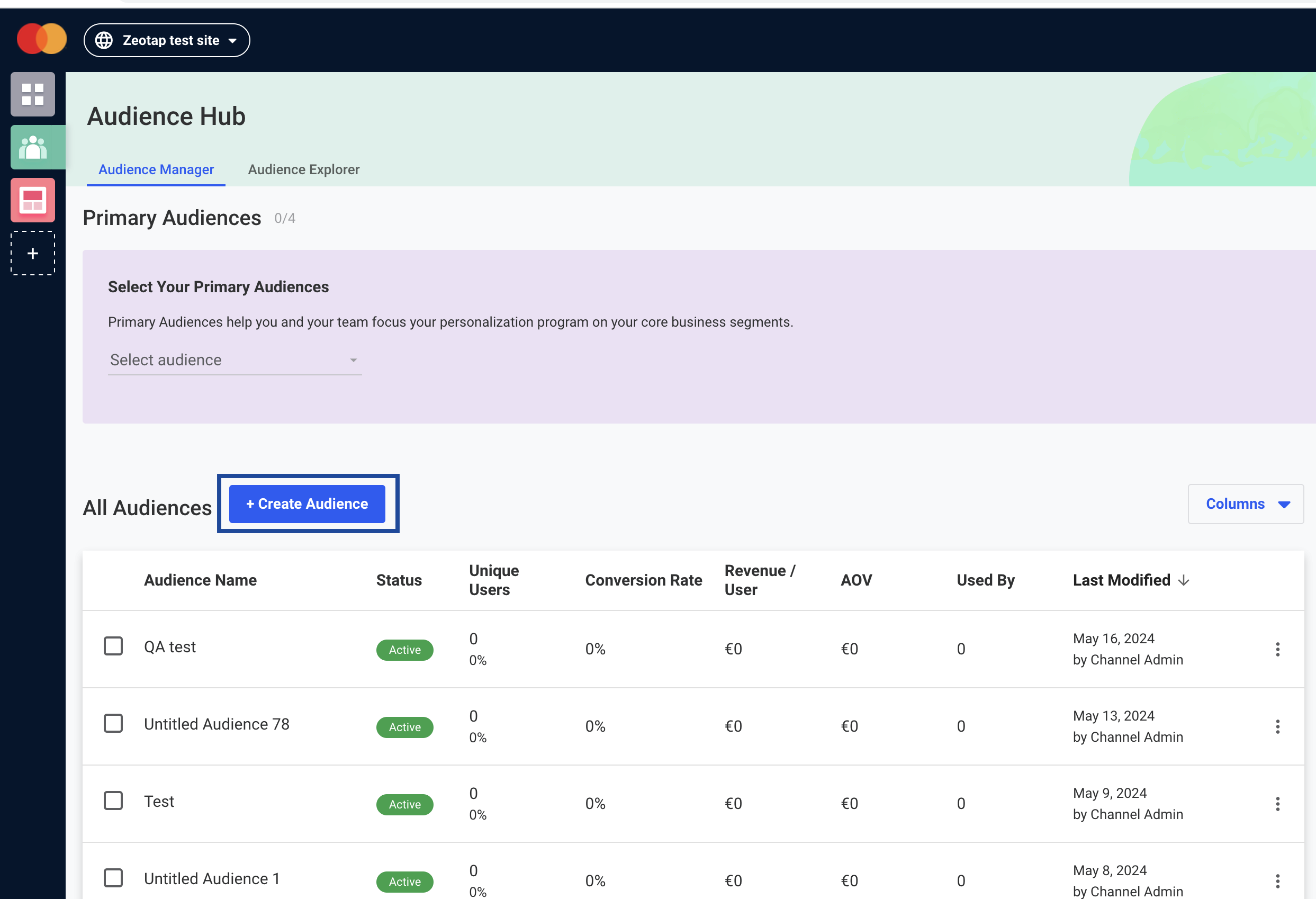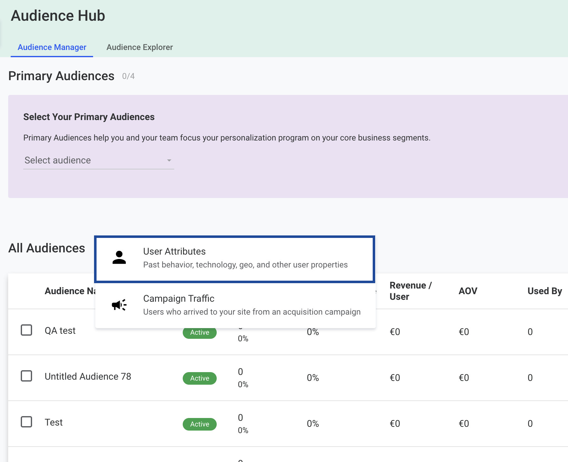 Perform the steps below to create audiences in Dynamic Yield:Under Conditions, provide the following details:a. In the first field, choose the User Data Feed that you wish to include for this Audience.b. In the second field, you can select the Segment ID, Segment Name, and any other identifiers and attributes that you have sent from Zeotap. Note that you can add any number of attributes that you wish to include for this Audience by adding new conditions.c. In the third field, choose the operator for the condition you are creating. It can be