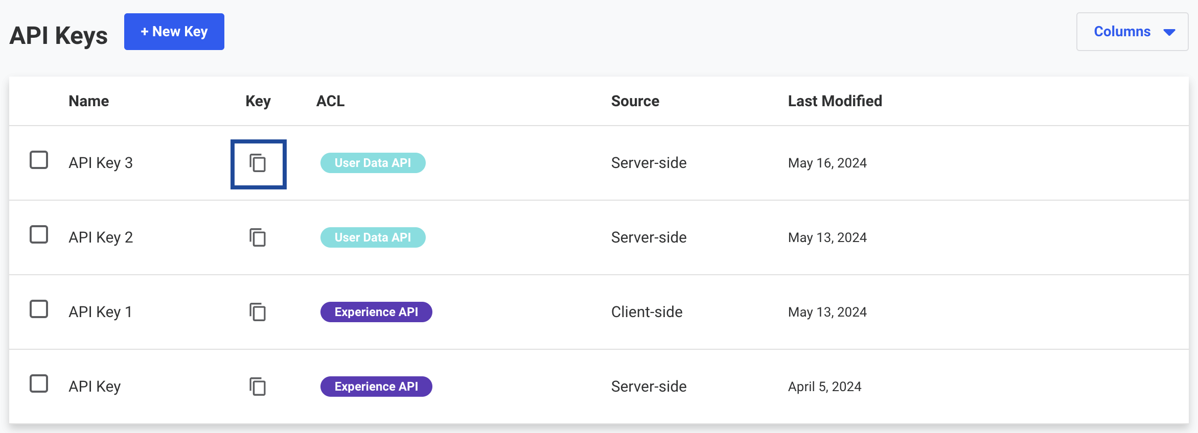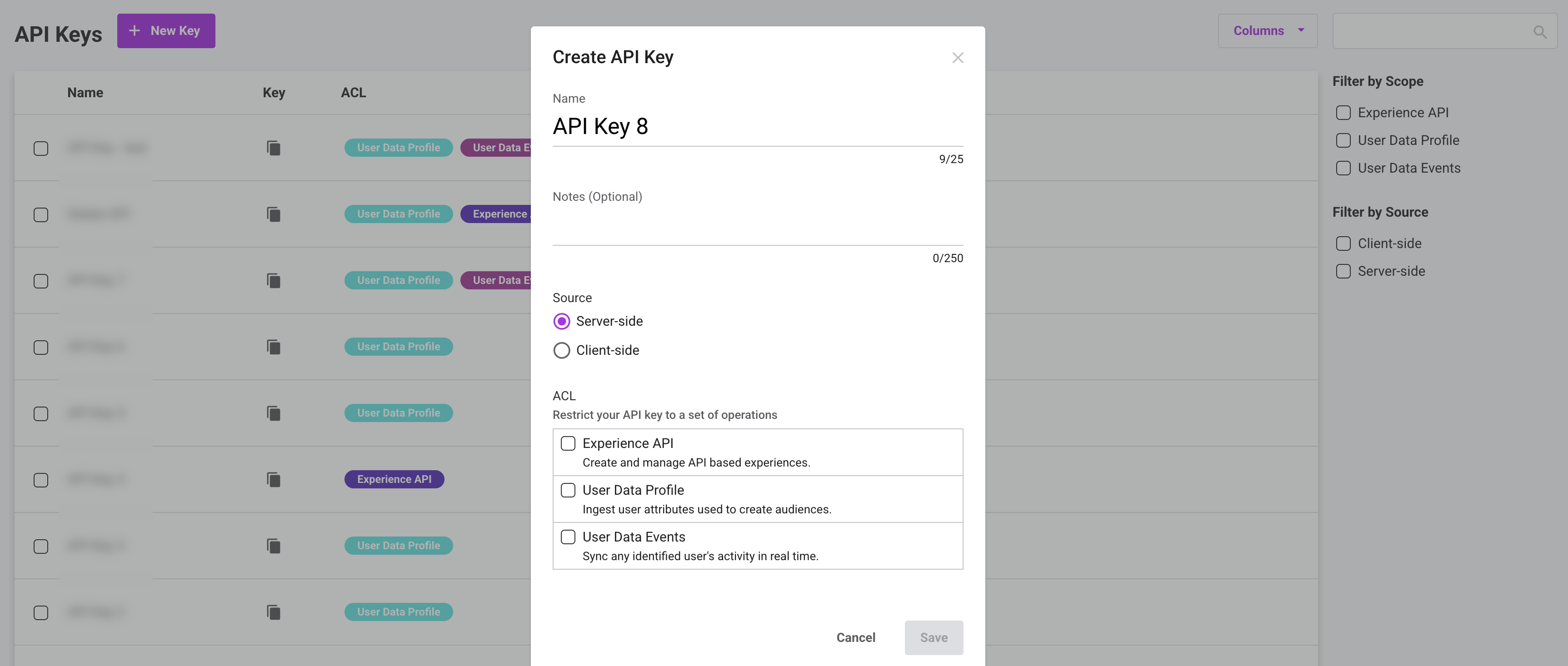 You must create an API Key which needs to be entered while creating a destination in Zeotap CDP. To do so, perform the following steps:In the window that appears, provide the following details:a. Enter a name, and internal notes (optional).b. For the source, select either Server-side or Client-side. Each type can be used only with its designated endpoint.c. In the ACL section, use the checkbox to select the User Data profile permission for the API Key.d. Click Save.