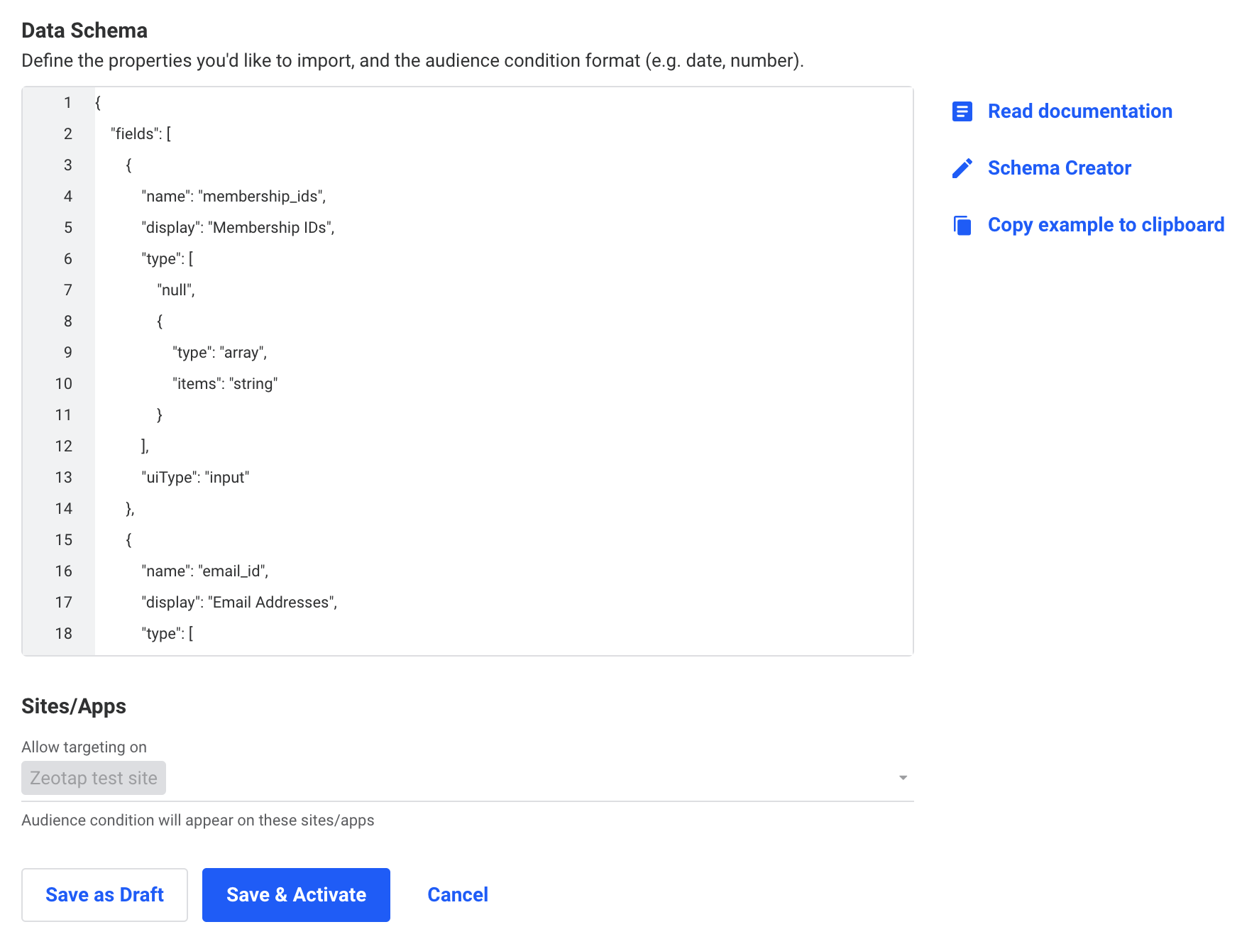 - If you select the above action, ensure that you include the segment_id, and segment_name in the schema using the format shown in the image below. You can also map the Membership ID field. Note that you can include any number of attributes and identifiers in the schema depending on your requirement/use case.