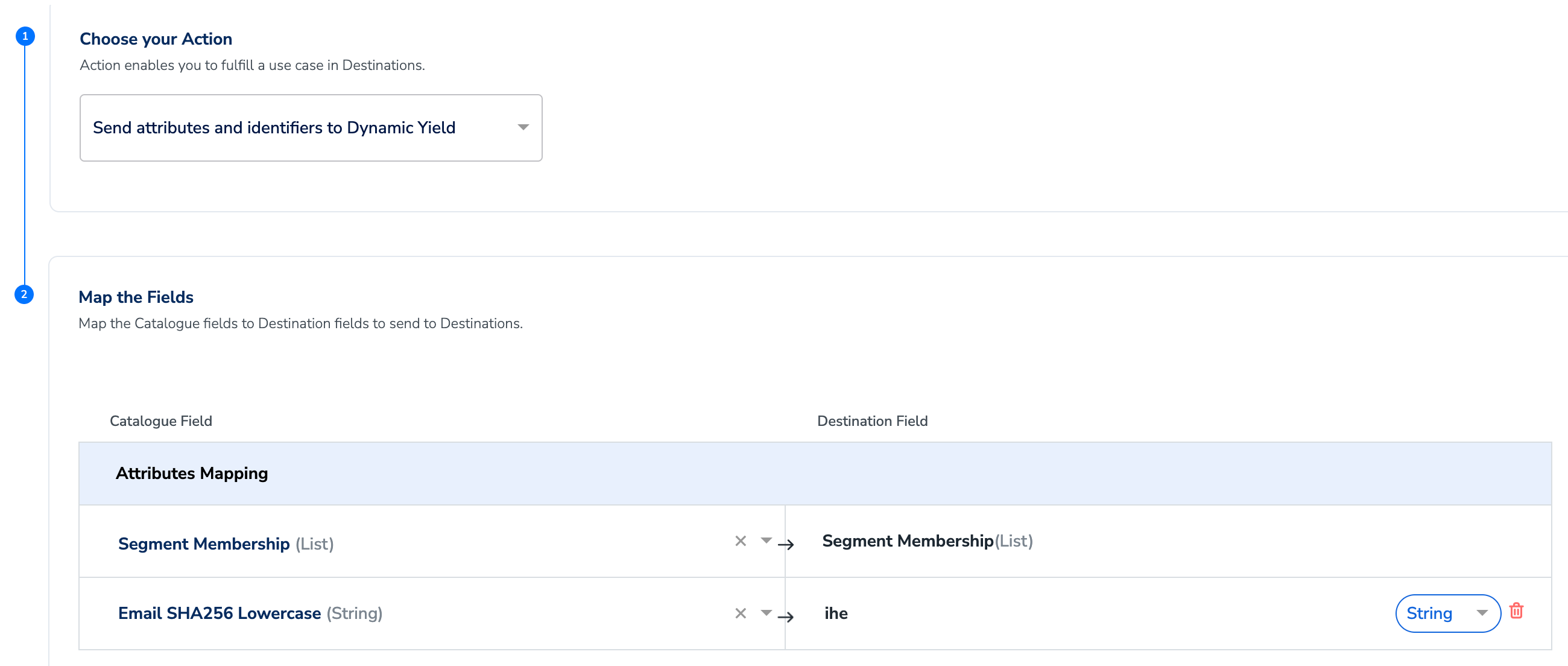 On the Action and Mapping screen, select either Send attributes and identifiers to Dynamic Yield or Send identifiers to Dynamic Yield as the action, based on the identifiers and attributes you want to send. Then, map the Catalogue and Destinationfields accordingly.a. If you choose Send identifiers to Dynamic Yield, then you can send only the email addresses to Dynamic Yield.b. If you choose Send attributes and identifiers to Dynamic Yield or Send attributes to Dynamic Yield (Array Operations), then you can send any number of identifiers or attributes. However, note the following points:i. You can map the Membership ID field.