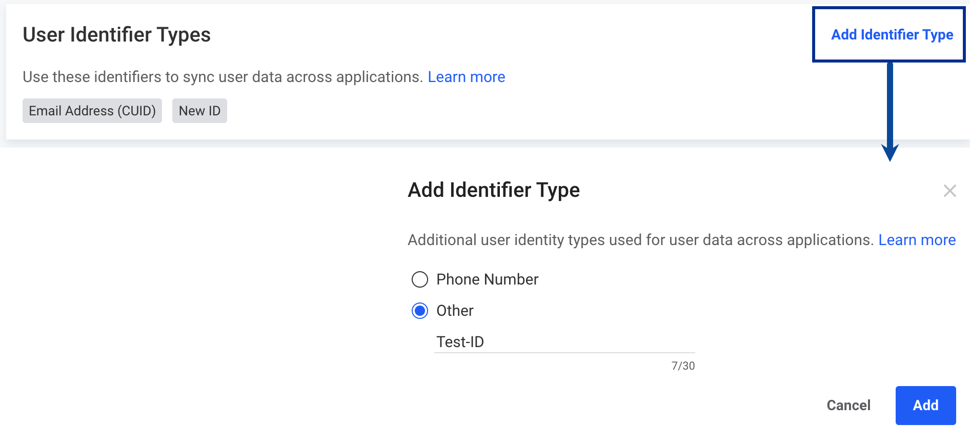 Under Unique User Identifier, by default, you can choose Email Address (CUID) or DYID. In case you want to add a custom identifier, you can do so by performing the following steps:Under User Identifier Types, click Add Identifier Type and choose either Phone number or Others. If you choose Others, then you can add a custom identifier in Dynamic Yield as shown below.