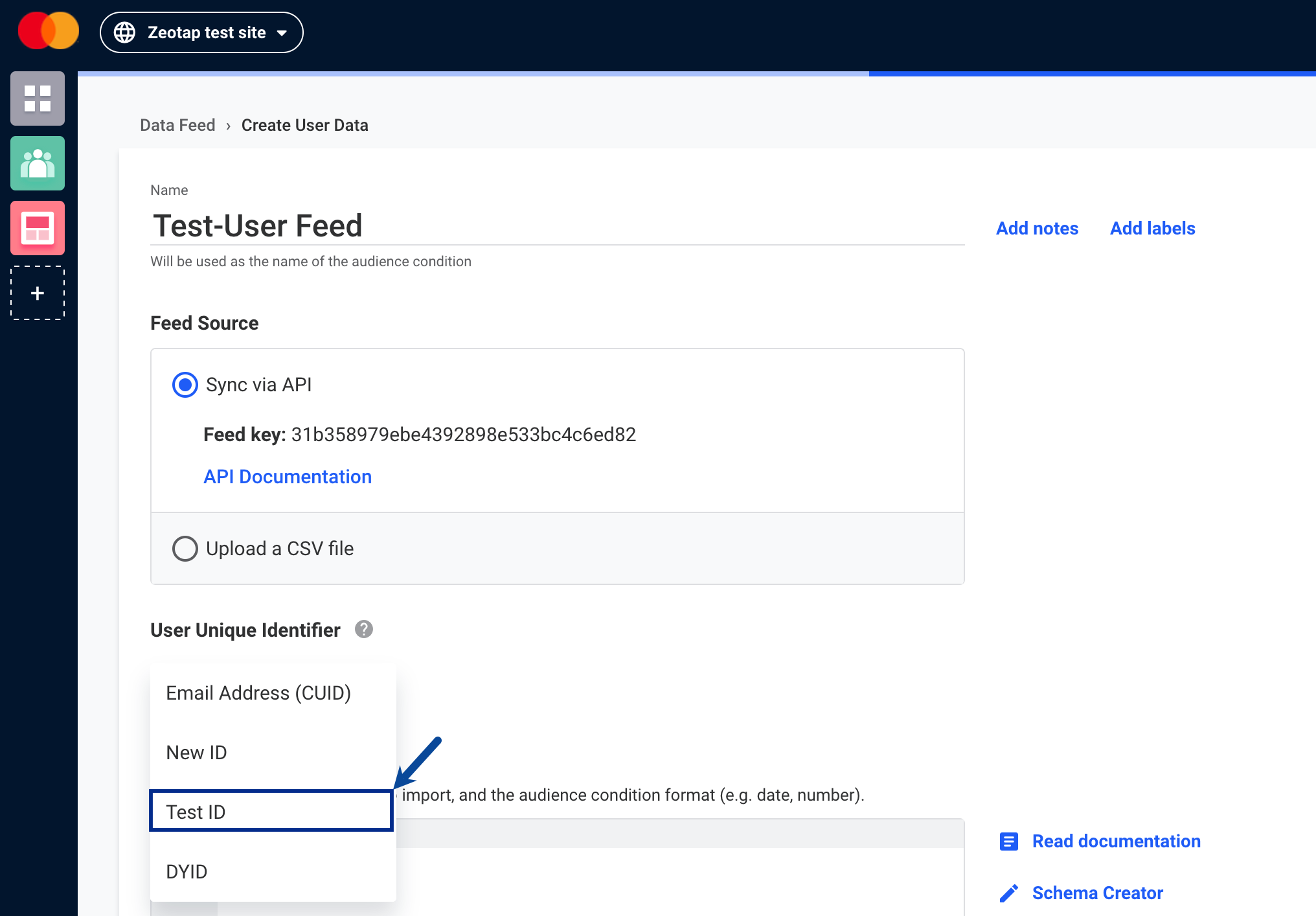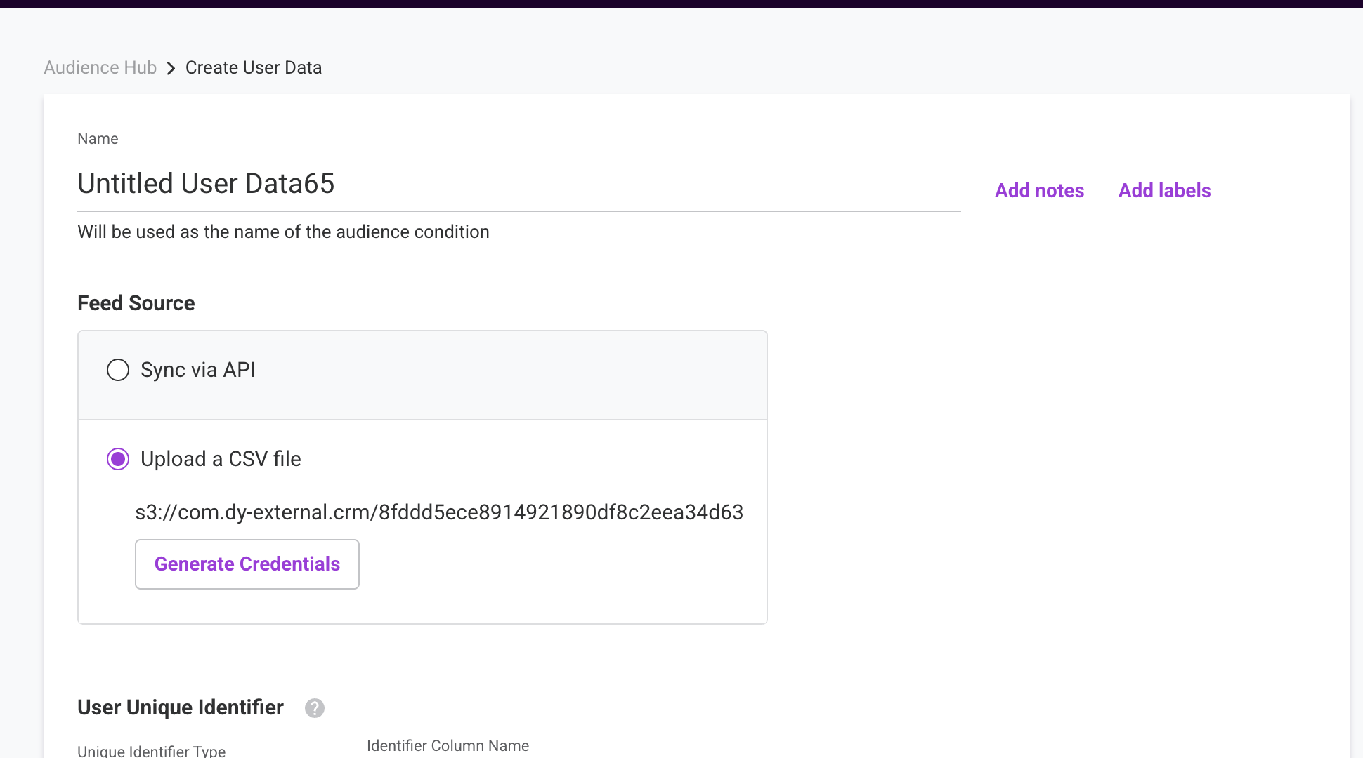 In Dynamic Yield, a User Feed ID refers to a unique identifier for a set of user data feeds that are used to drive personalised experiences across channels. A user feed can contain a variety of user data points, such as browsing history, purchase history and demographic information. To create a new User Feed and obtain the corresponding S3 credentials in Dynamic Yield, perform the following steps:In the new screen that appears, under Feed Source, select Upload a CSV file and click on generate credentials button.