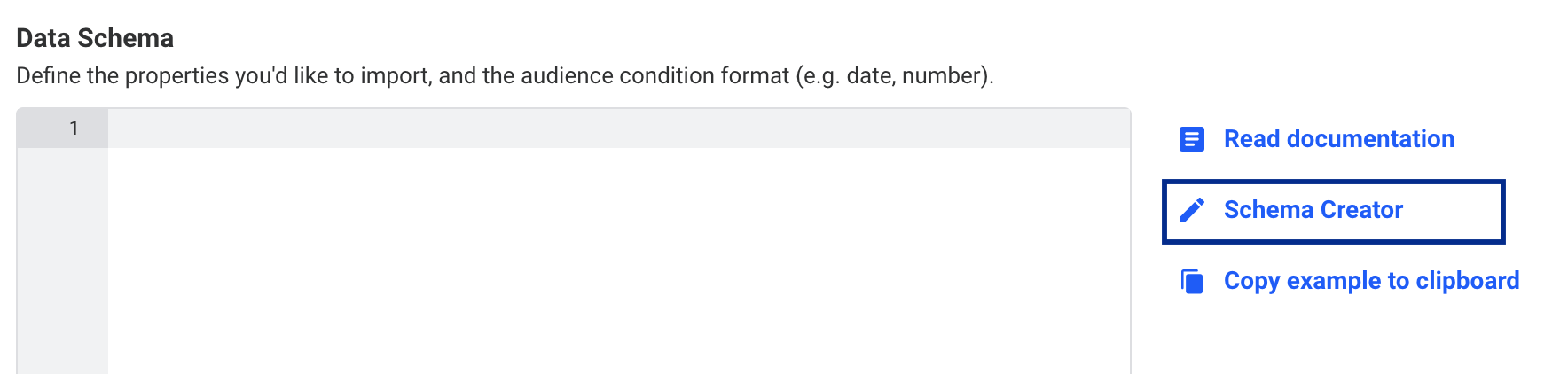 Under Data Schema, you must define the identifiers and attributes that you want to send to Dynamic Yield. To do so, you can use the Schema Creator as shown in the image below.