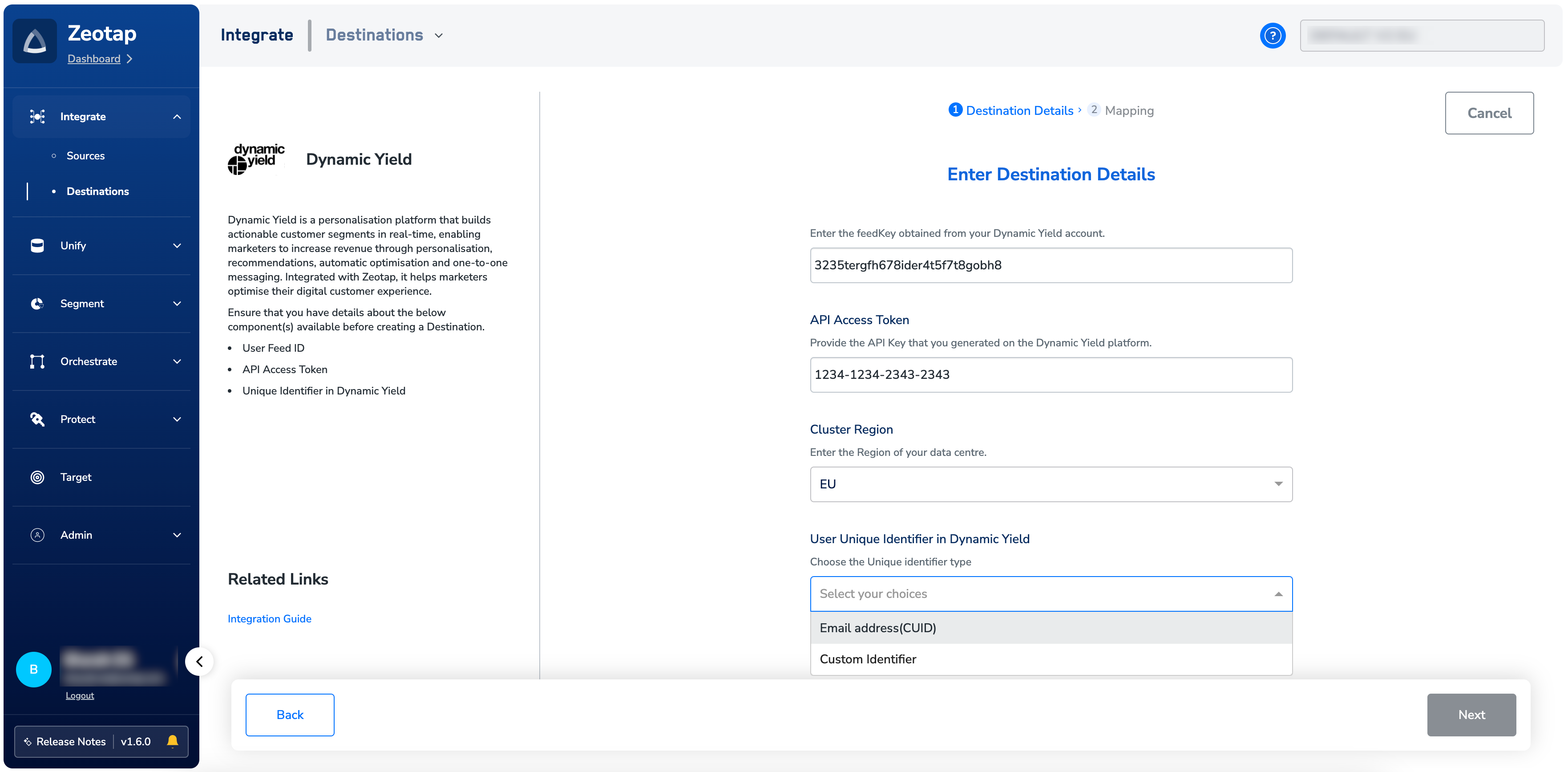 Note:Remove the s3:// prefix while entering the value in the Bucket Path field. If the Bucket Path in Dynamic yield is : s3://com.dy-external.crm/caf06308992a440381f102a4e19a0fb2, enter the value as com.dy-external.crm/caf06308992a440381f102a4e19a0fb2 in the Bucket Path field in Zeotap.