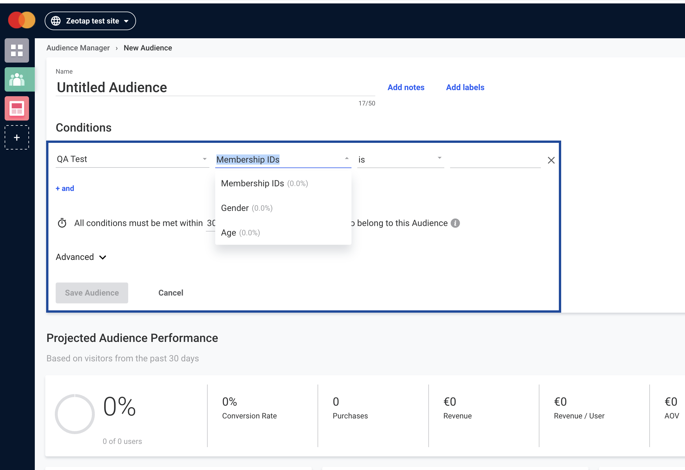 Perform the steps below to create audiences in Dynamic Yield:Under Conditions, provide the following details:a. In the first field, choose the User Data Feed that you wish to include for this Audience.b. In the second field, you can select the Segment ID, Segment Name, and any other identifiers and attributes that you have sent from Zeotap. Note that you can add any number of attributes that you wish to include for this Audience by adding new conditions.c. In the third field, choose the operator for the condition you are creating. It can be Is, contains, equals and more.d. In the fourth field, depending on the User Data Feed chosen, the values will populate. You can choose the desired value from the drop-down list.e. In addition, you can set the timeframe of the condition up to 30 days. Although options are available for 3 months or 1 year, you cannot select them as an error message saying “Projected performance is not supported for audience time frame over 30 days” appears.f. Once all the conditions are set for the audience, Click Save Audience.