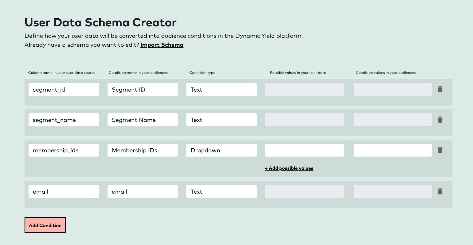 If you choose Start from Scratch, then in the new screen that appears, provide the following details:a. Under Column name in your user data source, enter the identifier name as provided in your data source. creating a destination in Zeotap CDP. For example if you are using first_name as the destination field in Zeotap, make sure to enter the exact name(case sensitive) in the “Column name in your user data source” column while creating the User data schema.b. Under Condition name in your audiences, enter the identifier name as you wish to see in the audiences.c. Choose the Condition type as per your requirement.i. Ensure that you include the Membership ID in the schema using the format shown in the image below. Please note that this action allows you to send only the identifier (Email, Phone, or Custom ID). Sending any additional attributes is not supported.d. Note: The Membership ID field must have the Condition Type set to Text Array.
