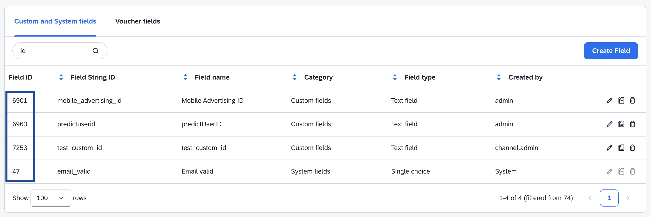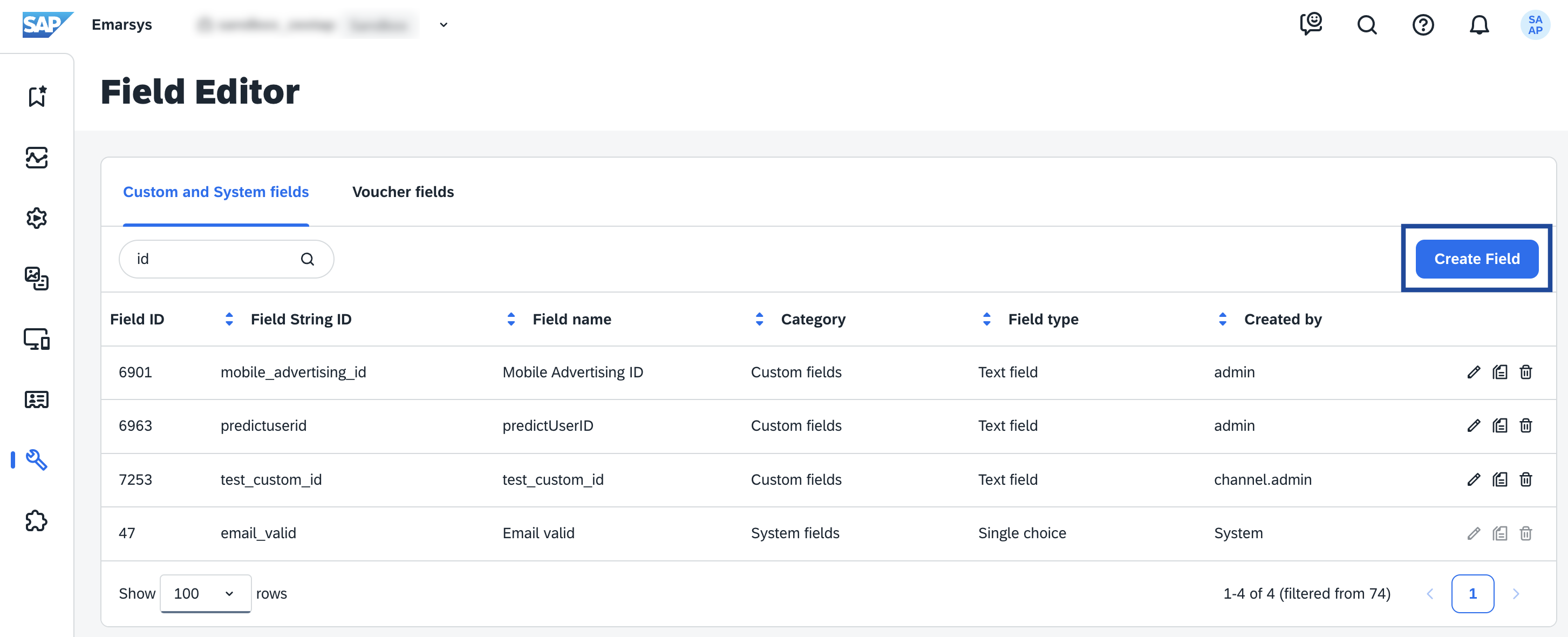 In Emarsys, this is the Field ID of your primary identifier, which you obtain from your Emarsys account. System fields such as raw email, first name, last name and so on, have predefined Key IDs. You can use these directly while creating the destination in Zeotap CDP. For more information about the system fields, refer to the Emarsys documentation.Note:If you want to use a Custom ID as the main identifier, then you must create a custom field in Emarsys and use the corresponding Field ID while creating the destination in Zeotap CDP. Ensure that the custom ID is activated through the Emarsys Support Team .