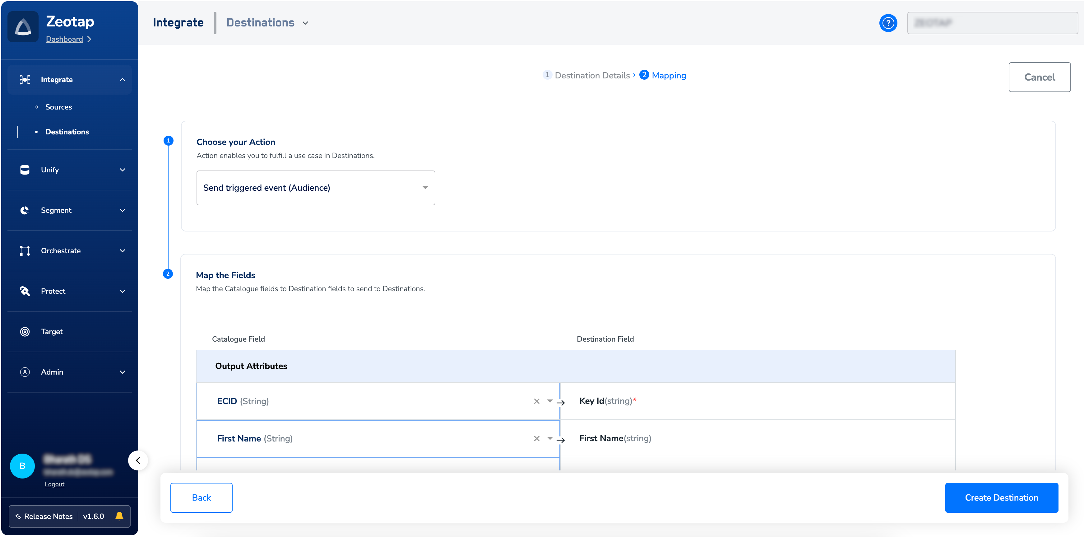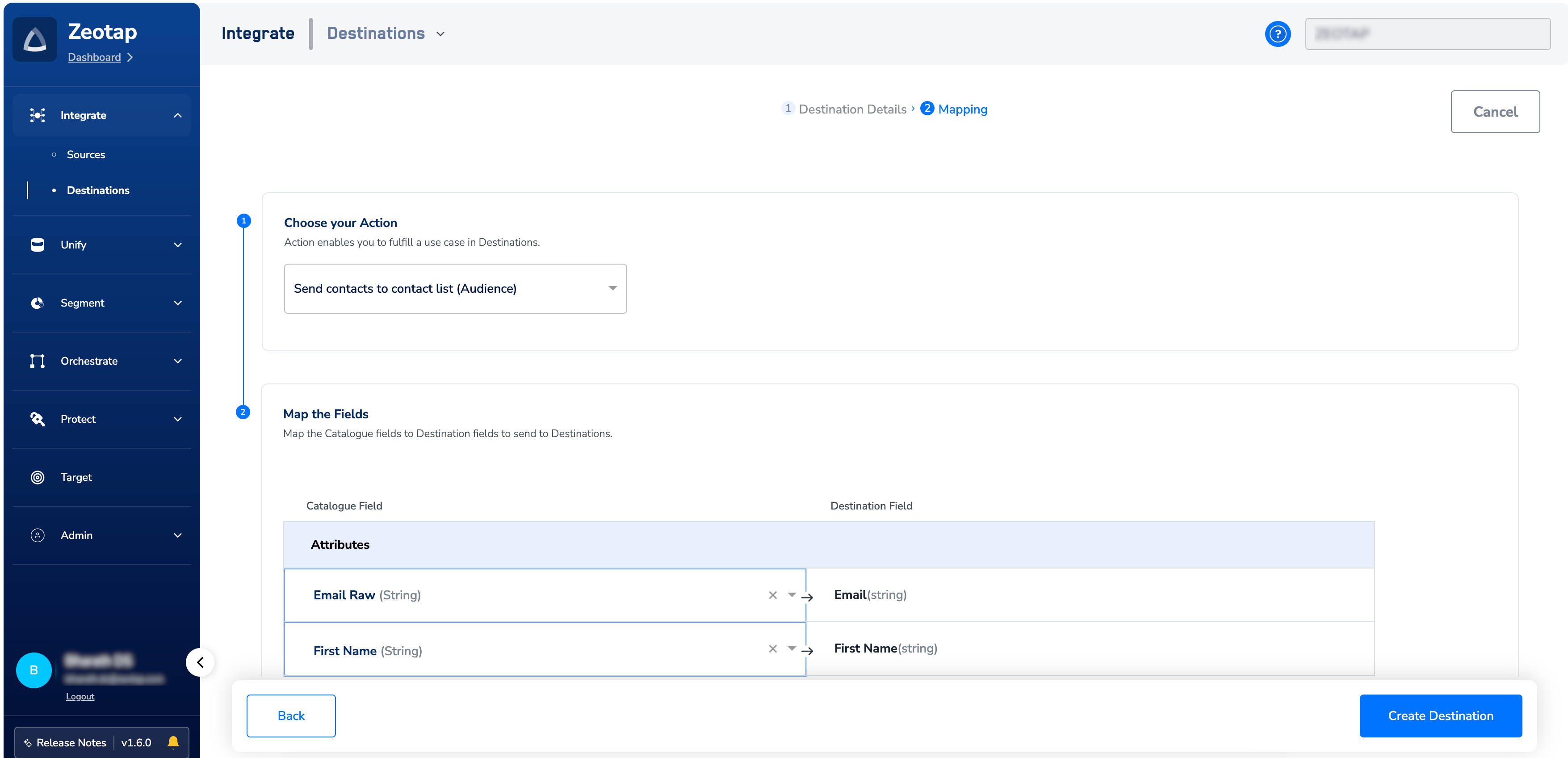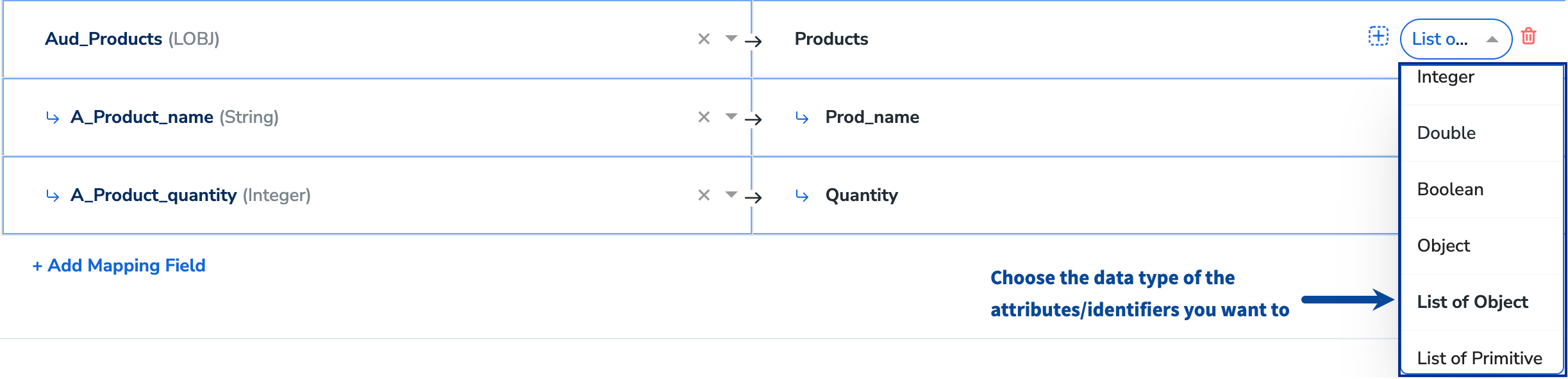 For this action, creating a new field on the Emarsys side is not required (unlike other audience actions, where it is necessary). Use the drop-down menu shown in the image below to choose the data type for your attribute or identifier and map the corresponding Catalogue fields to the Destination fields. When creating custom attributes, assign any name to the RHS/Destination field. The attribute appears in Emarsys with the same name as the Destination field in Zeotap CDP.If you select Objects or List of Objects, then you must also map the object properties below the object, as shown below. For more information about the data types supported and when to use them, refer here.