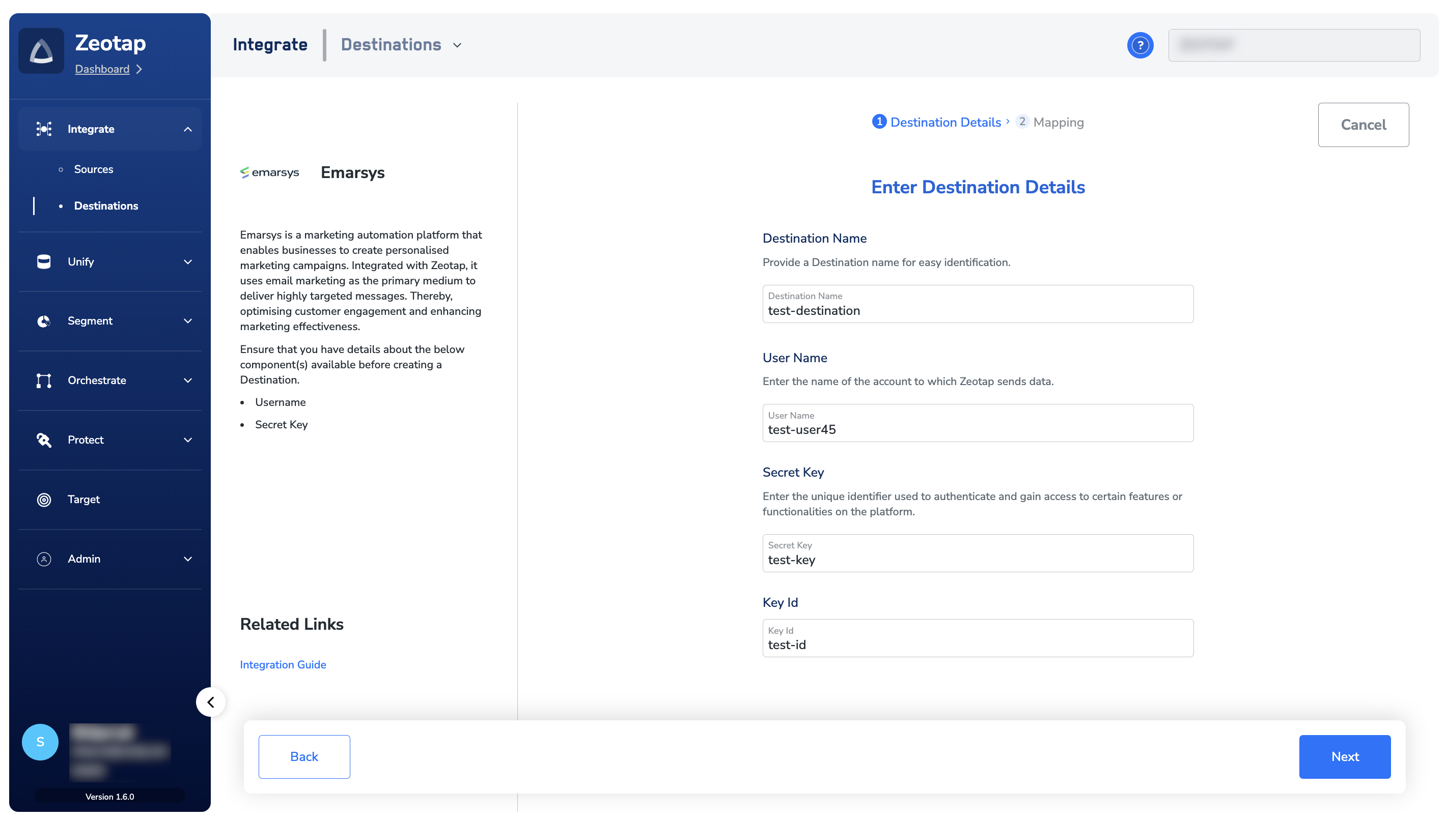 After obtaining the prerequisites as explained in the previous section, perform the following steps to create a Destination for Emarsys:Click Emarsys. A screen appears displaying details about the particular destination towards the left. On the right-hand side of the screen, find a list of fields that are required for the integration to be established. Enter the required details as mentioned in the following steps:a. Enter a name for the Destination.b. Enter the User name of the account to which Zeotap sends data. For information about how to obtain this from Emarsys, refer to the Prerequisitessection.c. Enter the Secret Key obtained from your Emarsys account. For information about how to obtain this from Emarsys, refer to the Prerequisites section.d. Enter the Key ID. For information about how to obtain this from Emarsys, refer to the Prerequisites section.e. Review all the values entered above and then click Next to proceed.