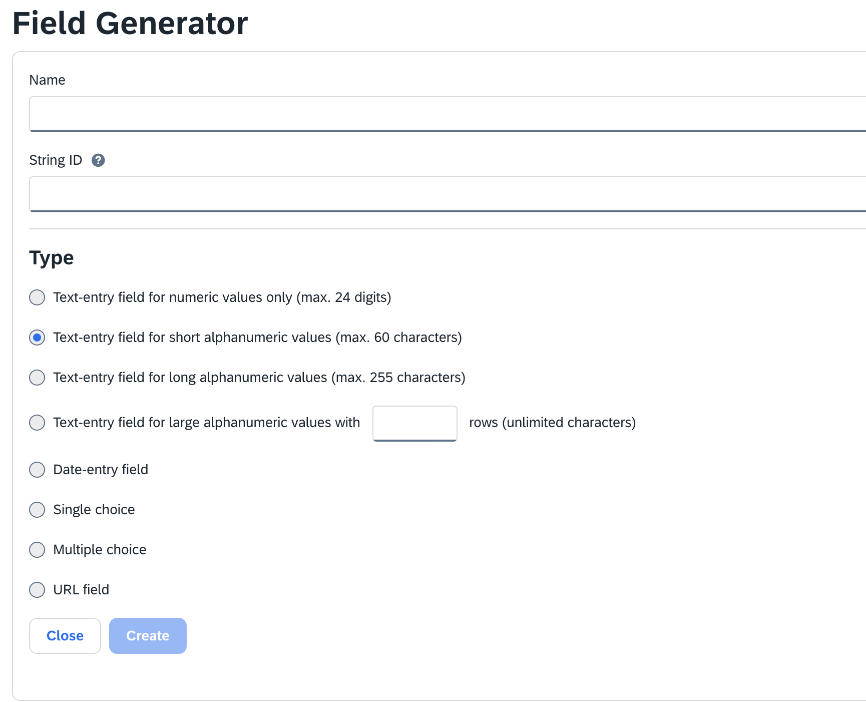 In the Field Generator page that appears, provide the following details:a. Enter Name for your identifier.b. Provide a String ID for your identifier.c. Choose the Type of your identifier.d. Review all the details and click Create.