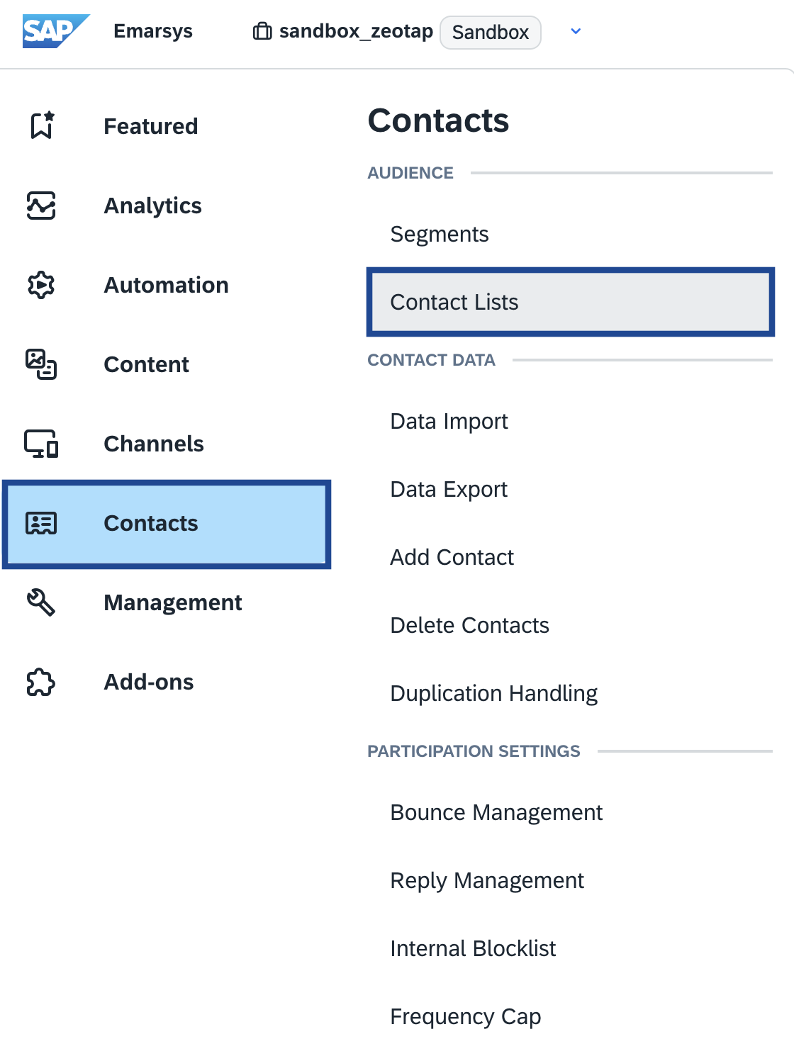 Perform the following steps to view the pushed Audiences (segments) on the Emarsys platform:Log into Emarsys and navigate to Contacts > Contact Lists.