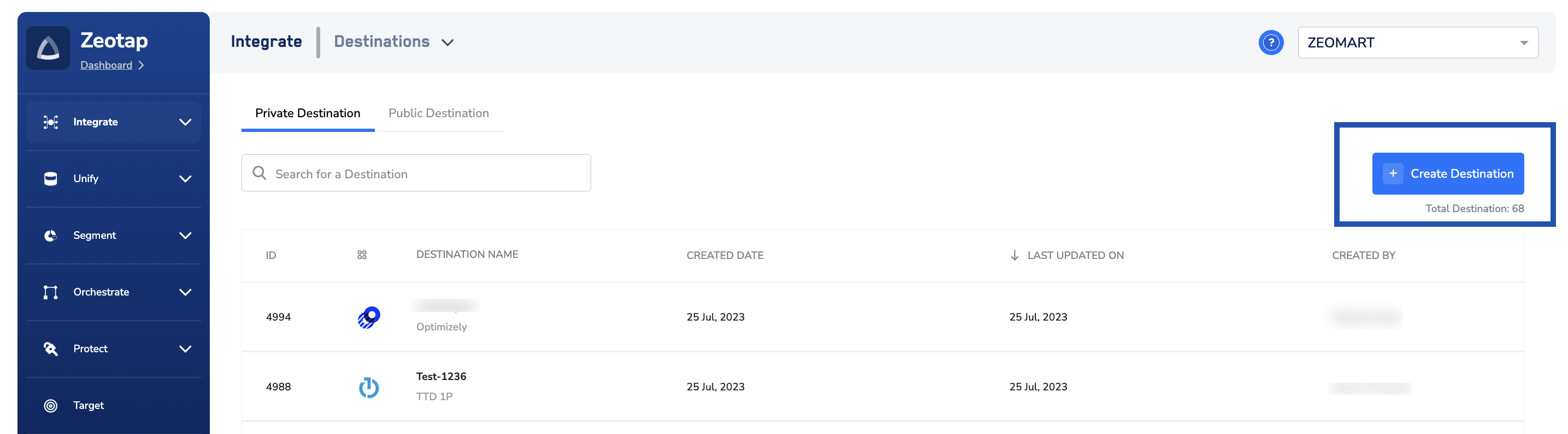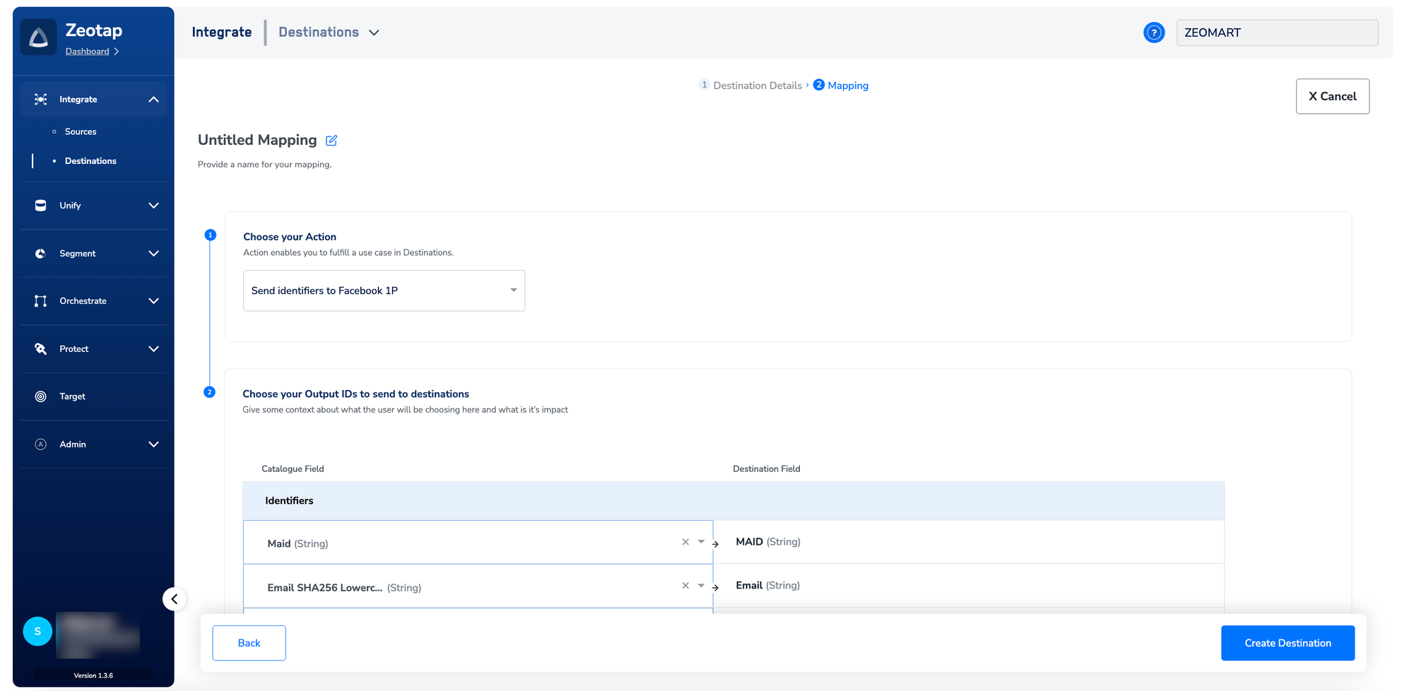Once you have completed the above mentioned prerequisites, perform the following steps to set up the integration between Zeotap CDP and Facebook 1P:1. Create a Destination for Facebook 1P
